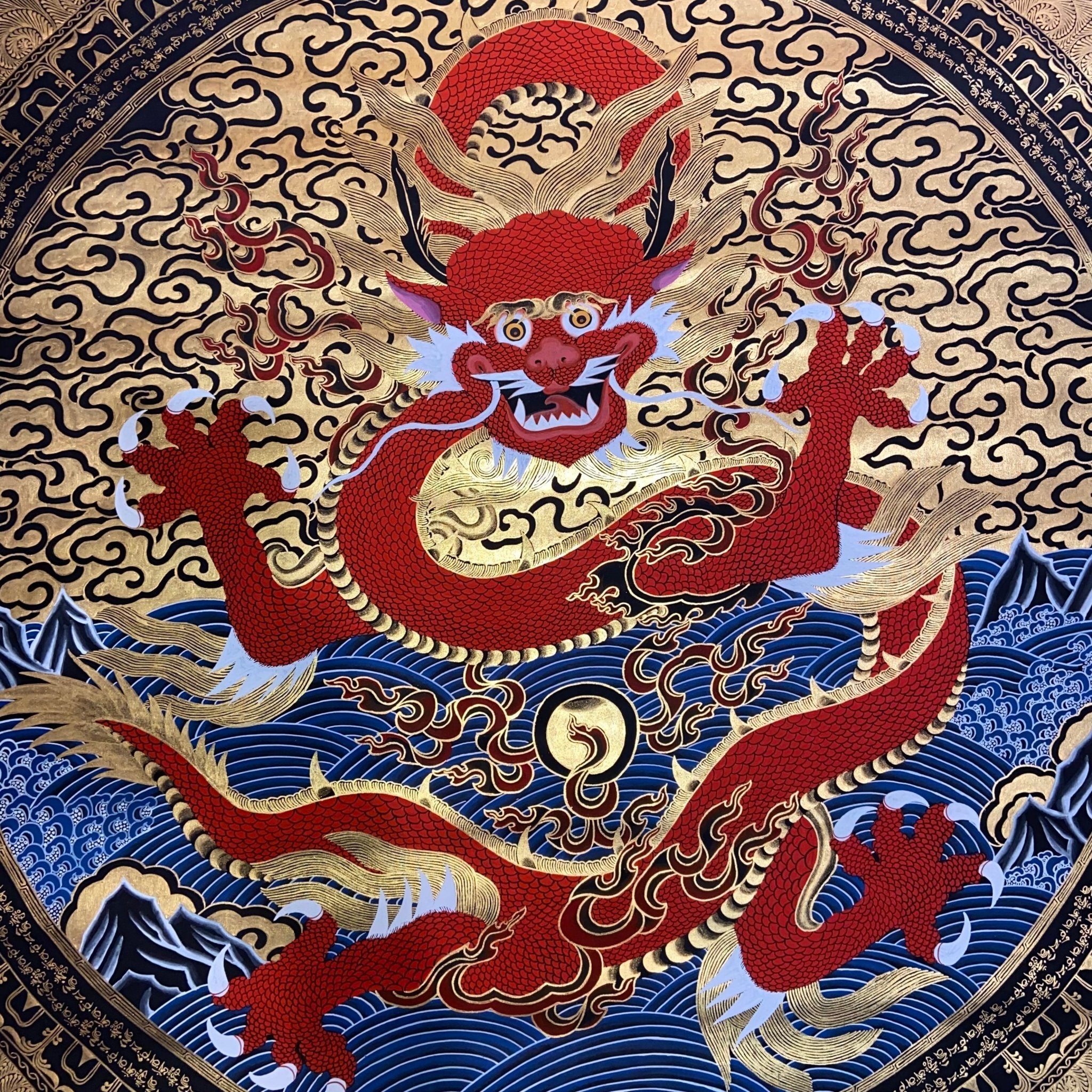 The Dragon Mandala is designed with perfect symmetry, following the principles of sacred geometry. Mandalas, as spiritual tools, are used for concentration and meditation, helping practitioners tap into their inherent energy and align their mind, body, and spirit. This Thangka, like all Tibetan mandalas, serves as a guide for establishing a sacred space, facilitating a harmonious flow of energy and creating an atmosphere conducive to meditation and spiritual practice.