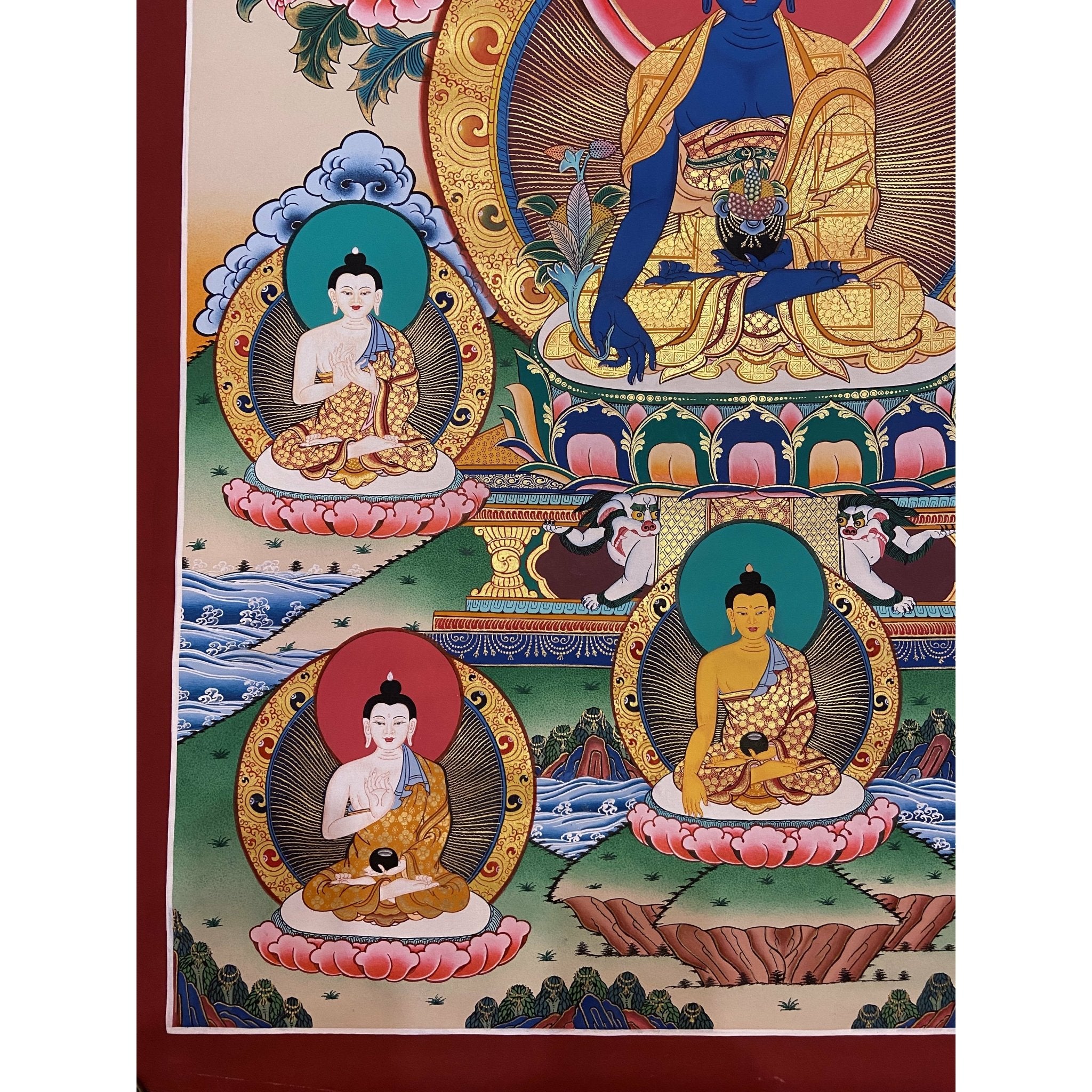 Healing and Protection: Meditating in front of the Medicine Buddha Thangka is believed to alleviate physical and mental stress, strengthen healing powers, and protect against spiritual sickness, attachment, hatred, and ignorance.
