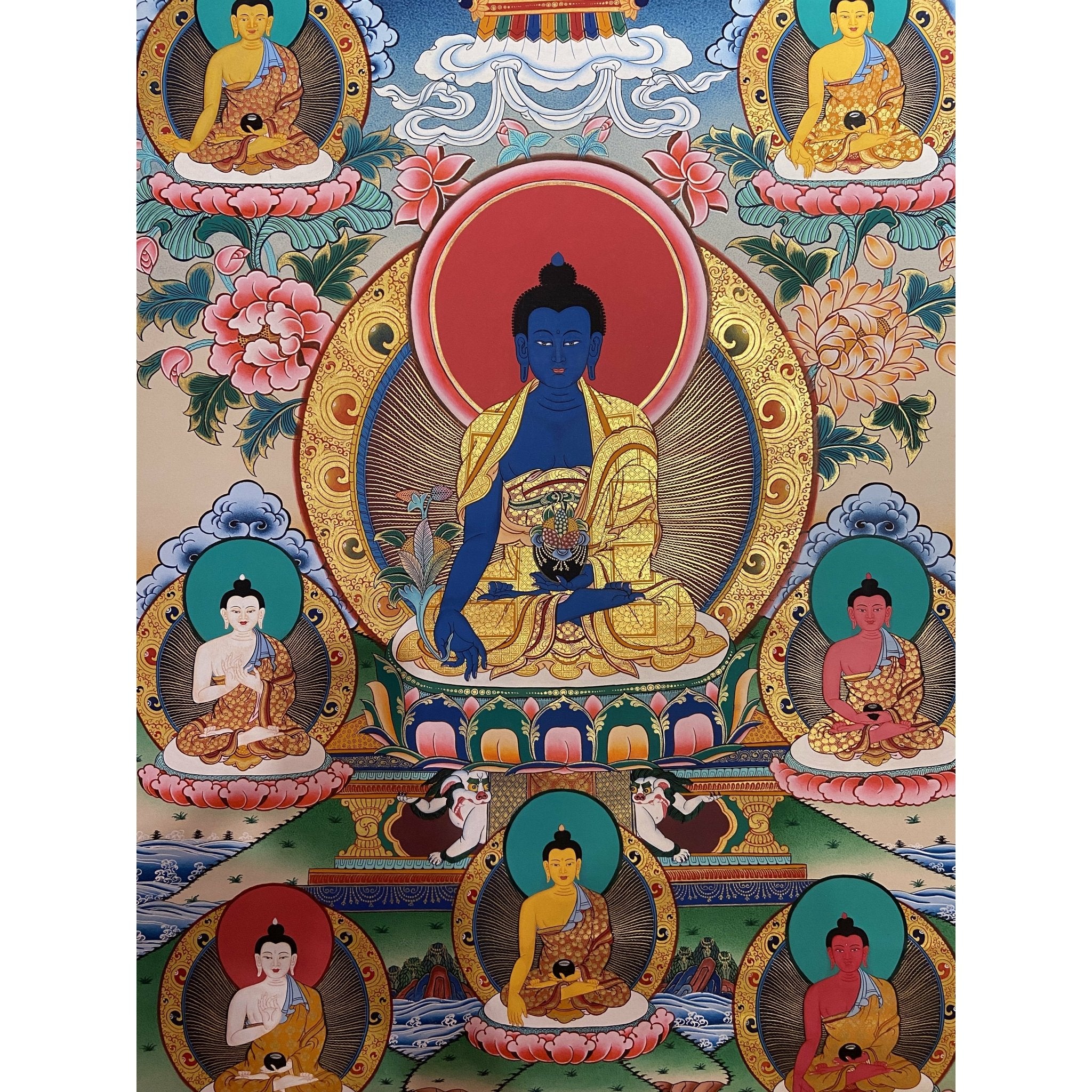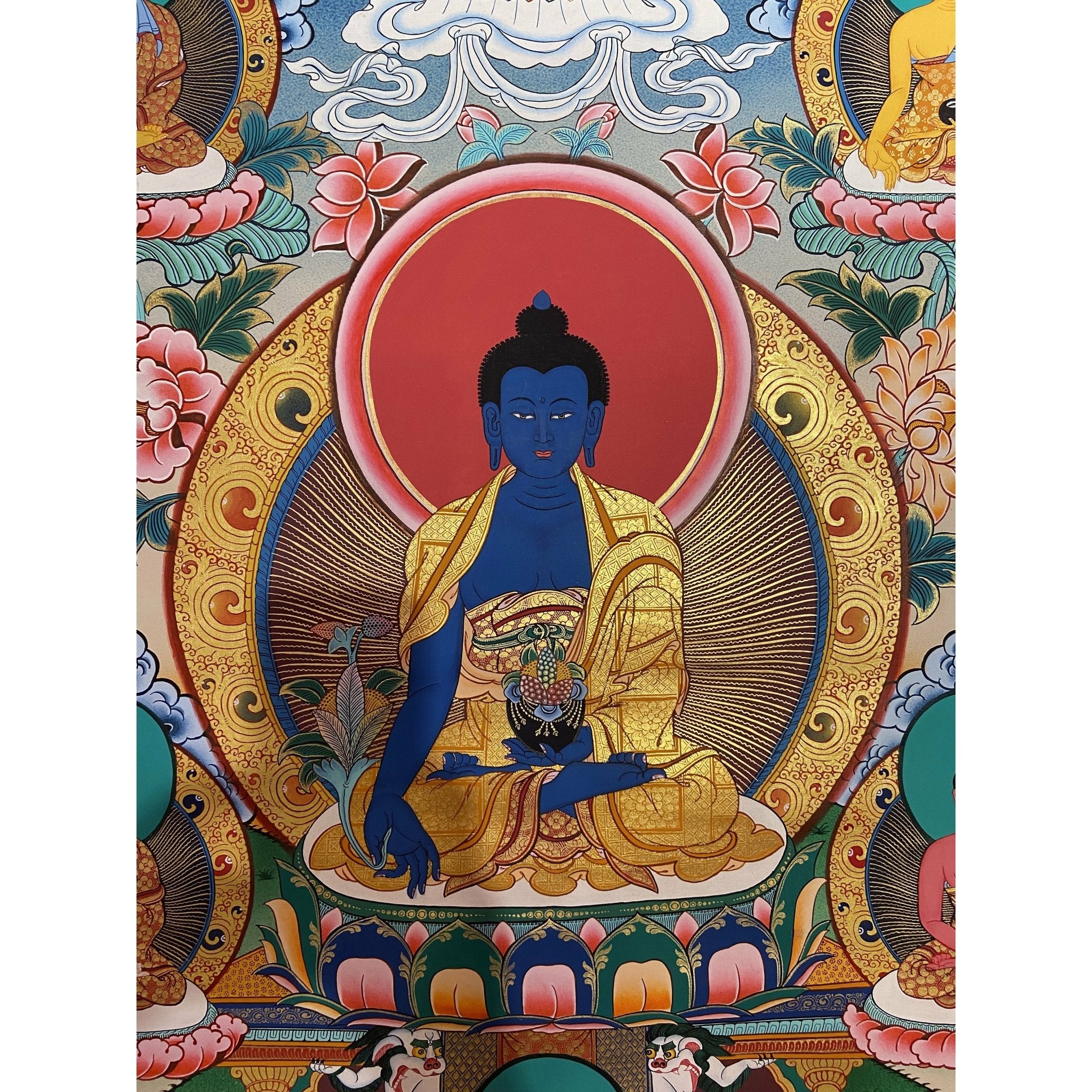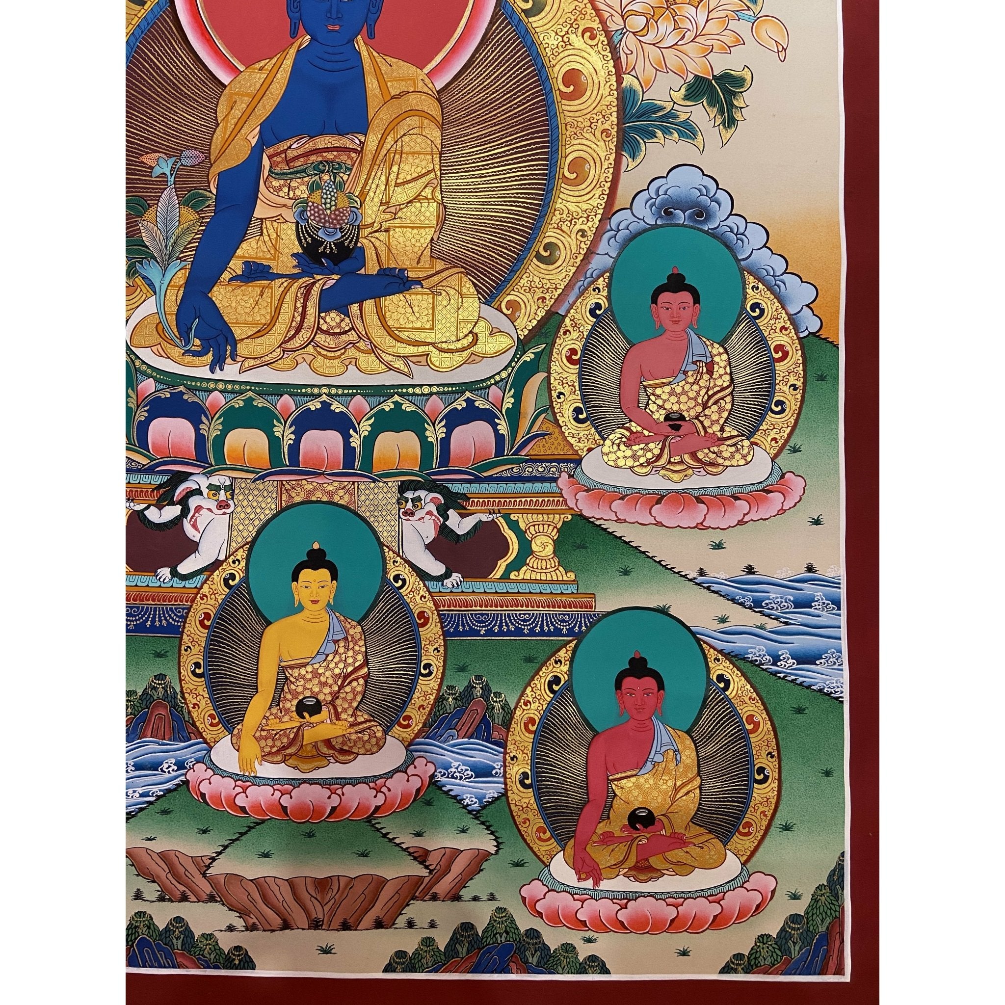 About the Medicine Buddha Thangka This Thangka depicts Bhaisajyaguru, the Medicine Buddha, a revered figure in Tibetan Buddhism known for his ability to heal and purify both physical and spiritual ailments. He is seated in a cross-legged position on a lotus throne, symbolizing his mastery over healing and his unwavering compassion for all sentient beings.