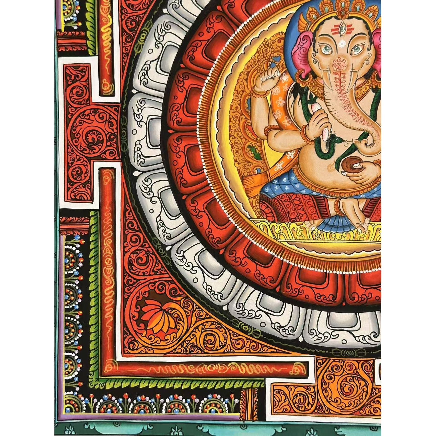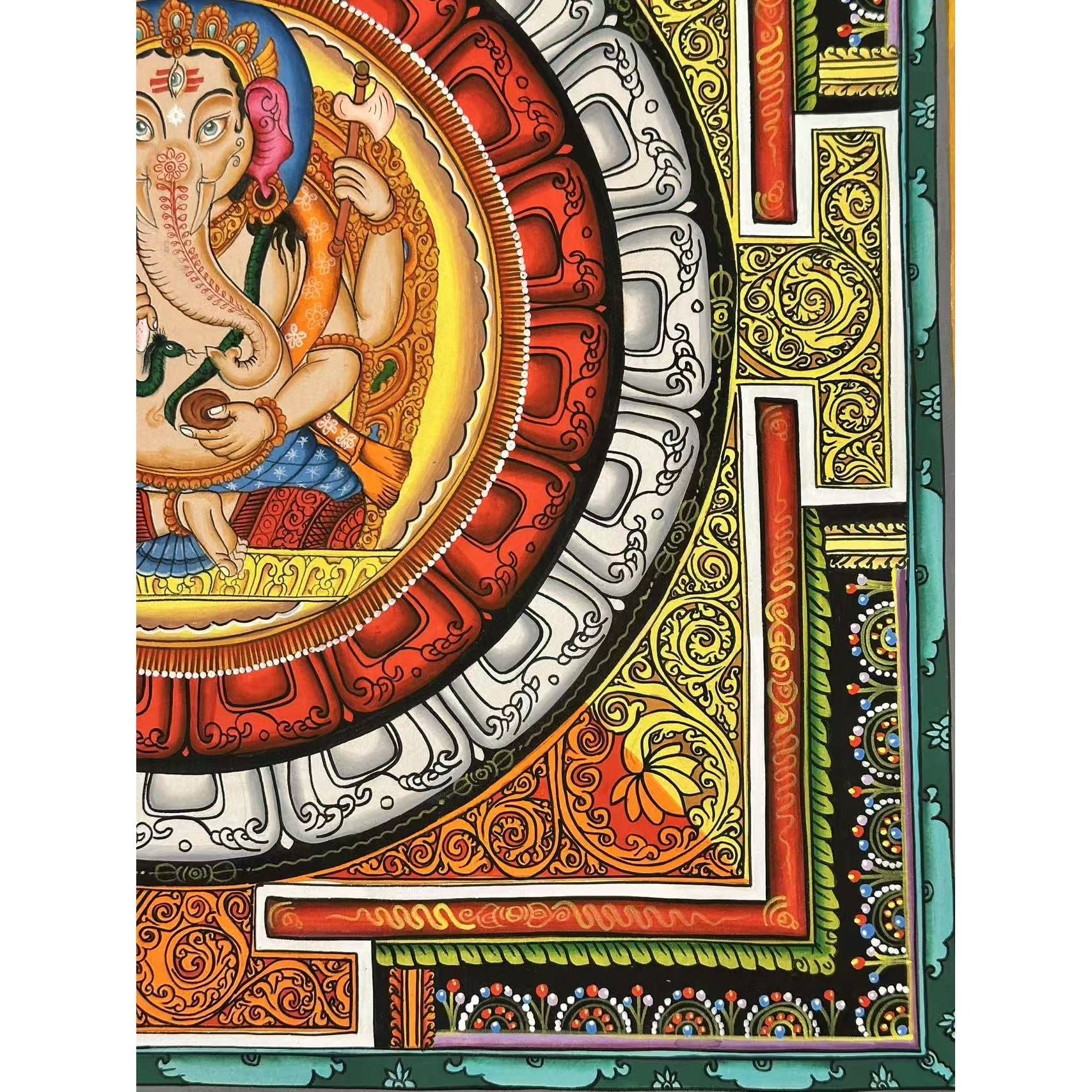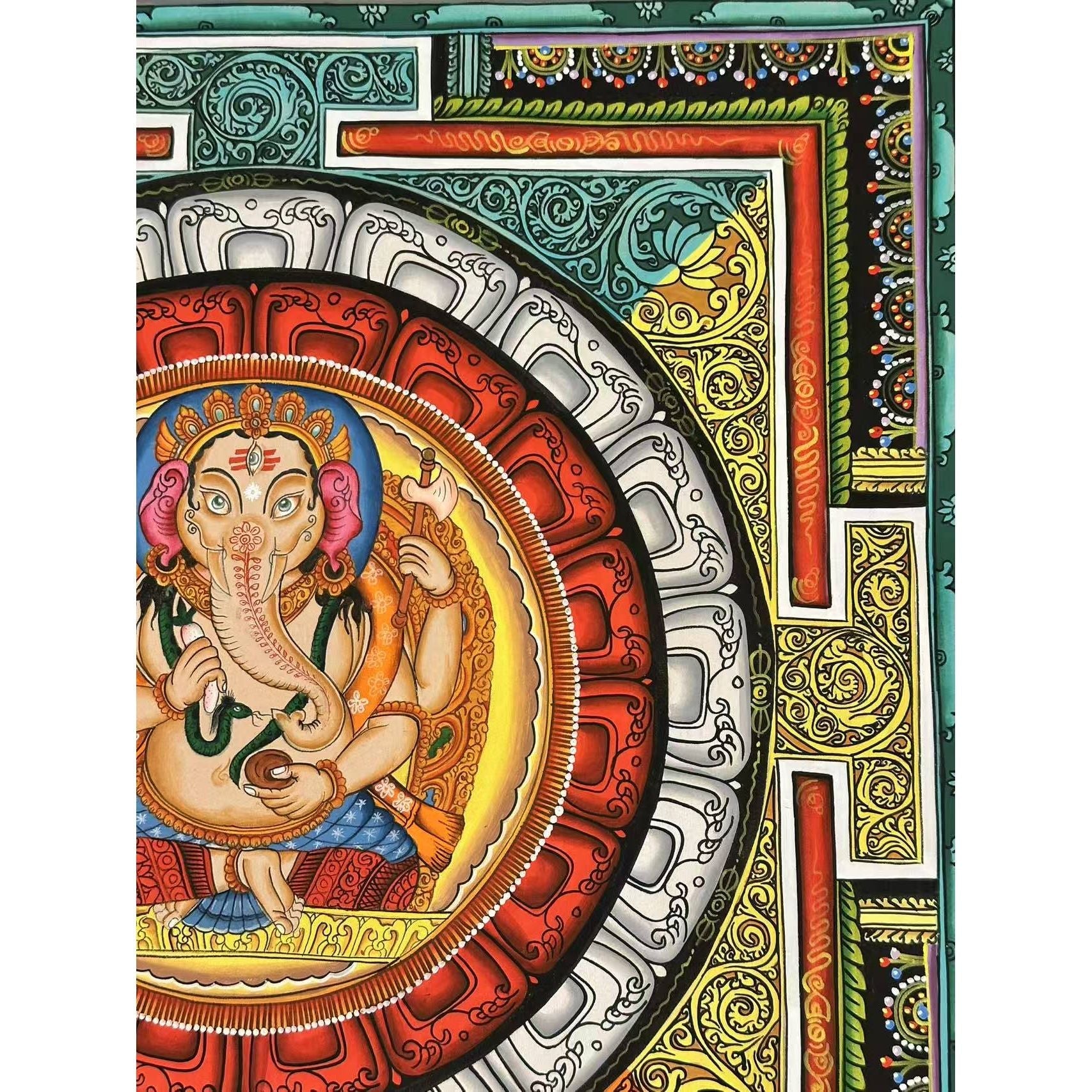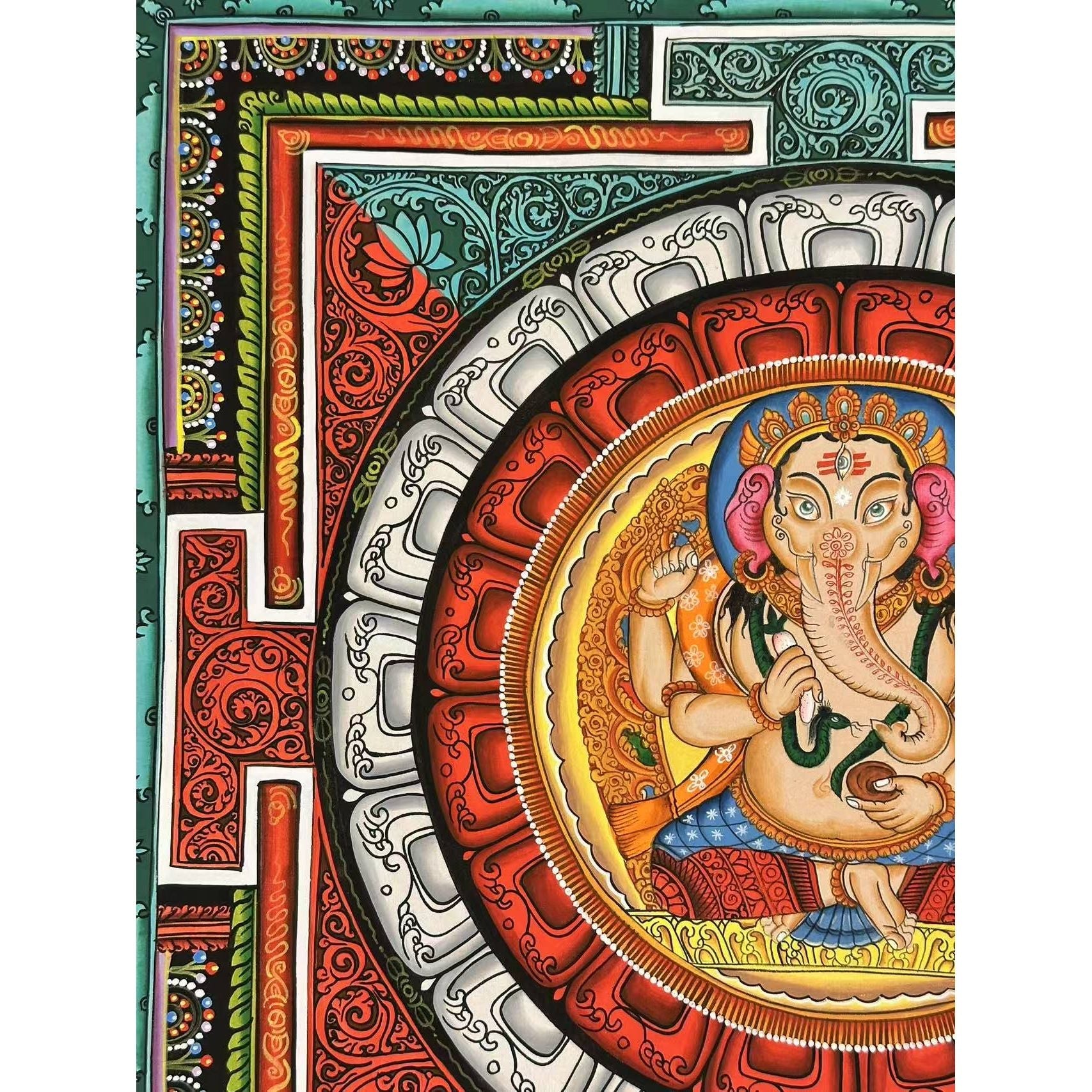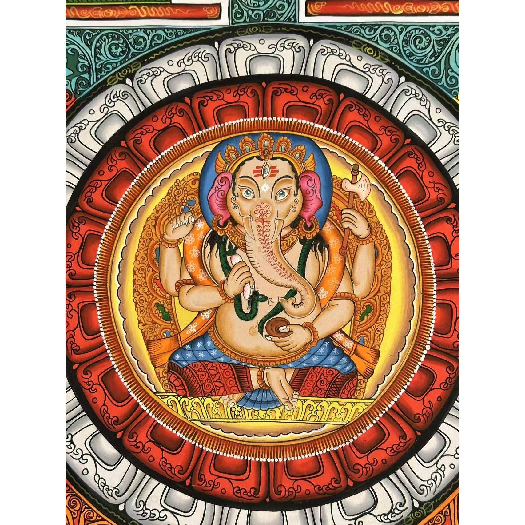 About Ganesh Mandala Thangka Art This Thangka painting features a sacred Ganesh Mandala, which serves as a tantric tool for concentration and meditation. The use of Mandalas is deeply rooted in both Hindu and Buddhist traditions as a means of connecting with spiritual energy and fostering inner peace. In Hinduism, Ganesh is one of the most worshipped deities, recognized as the remover of obstacles, the bestower of good luck, and the patron of intellect, education, and wisdom.