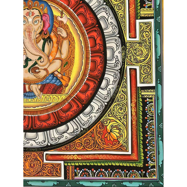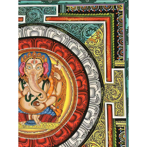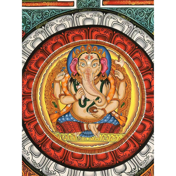 This stunning Ganesh Mandala Thangka is perfect for enhancing your home or office décor with spiritual depth and elegance. Handcrafted with the finest craftsmanship in the Kathmandu Valley, Nepal, this 100% hand-drawn Thangka can serve as a centerpiece or be placed on your family altar to promote meditation, emotional healing, and attract the benevolent energy of Tibetan Buddhist art.