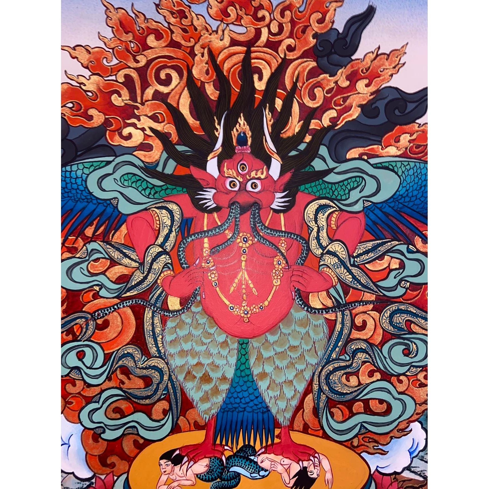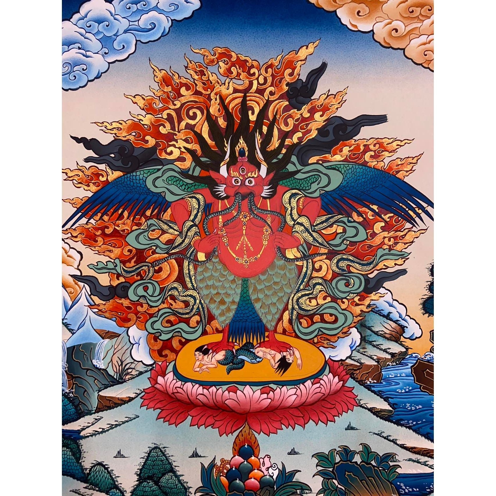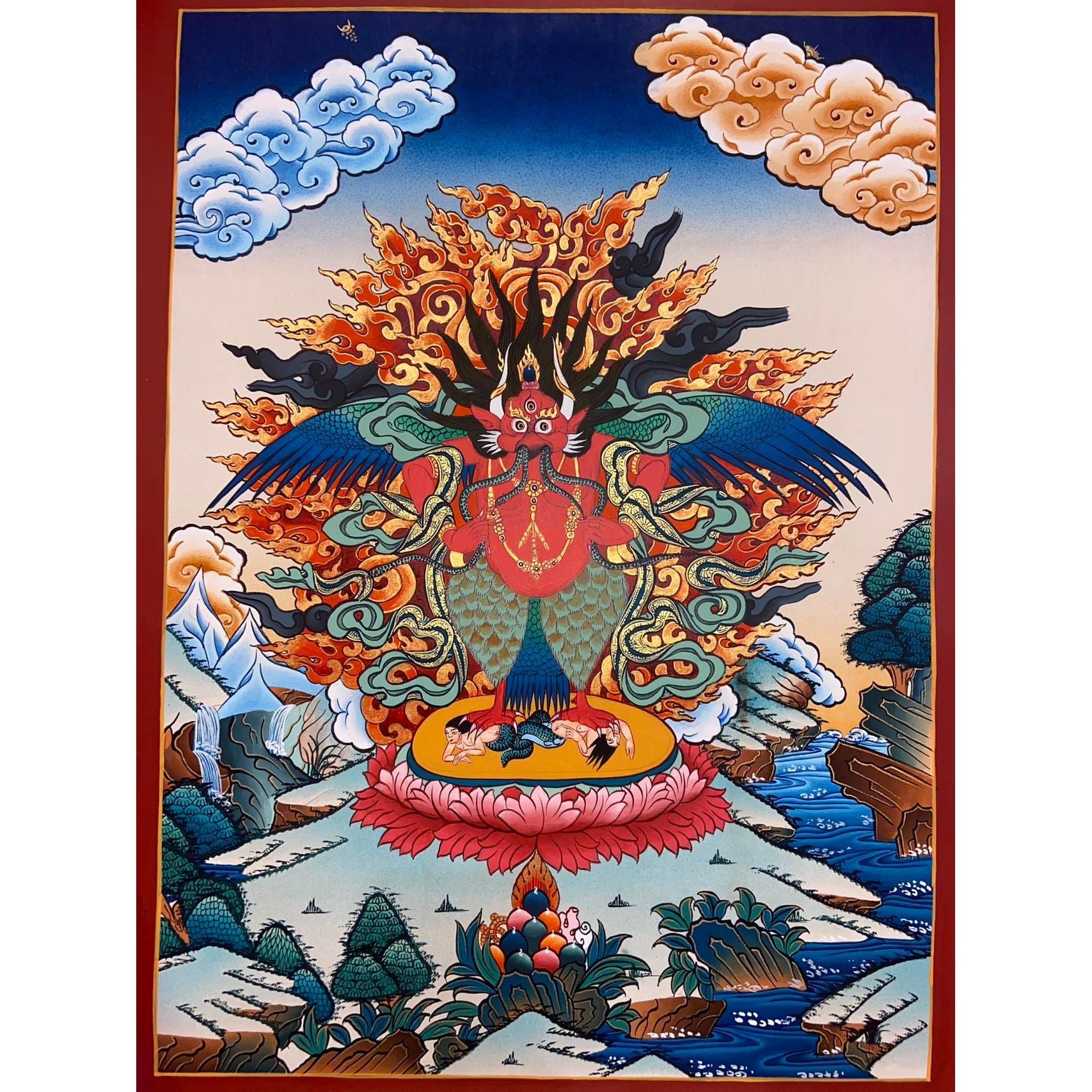 About Garuda Thangka Art In Buddhism, Garuda is a mythical bird-like creature with a wingspan said to be many miles wide. Known for bringing hurricane-force winds with the flap of its wings, Garuda is often depicted with a snake in its mouth, symbolizing its long-standing war with the nagas, the serpentine water spirits. Despite this, the Garuda became a symbol of refuge after the Buddha intervened to protect the nagas from Garuda's attack.