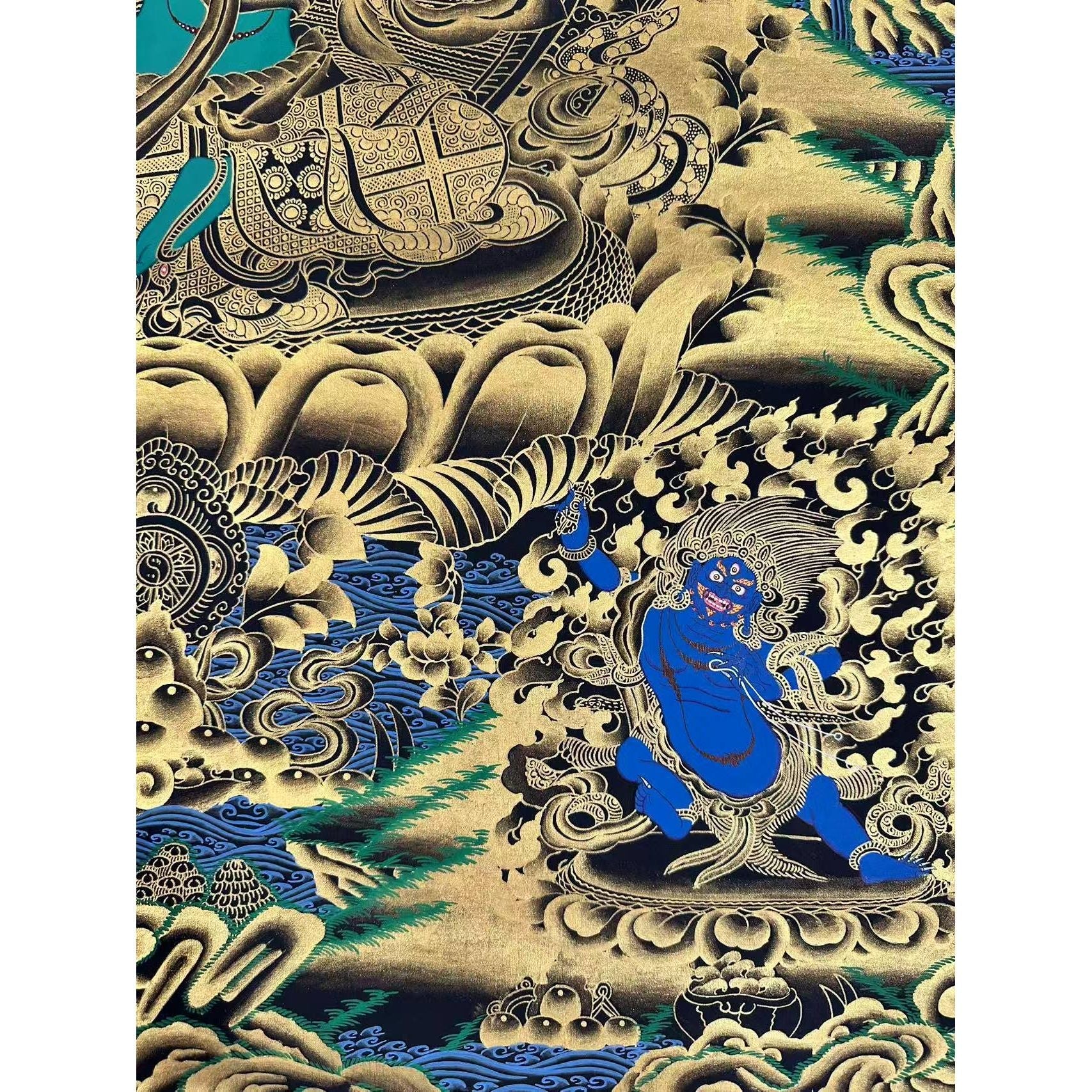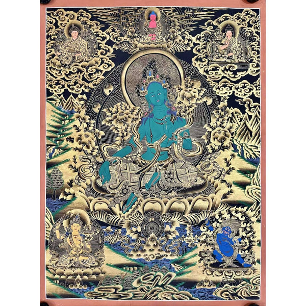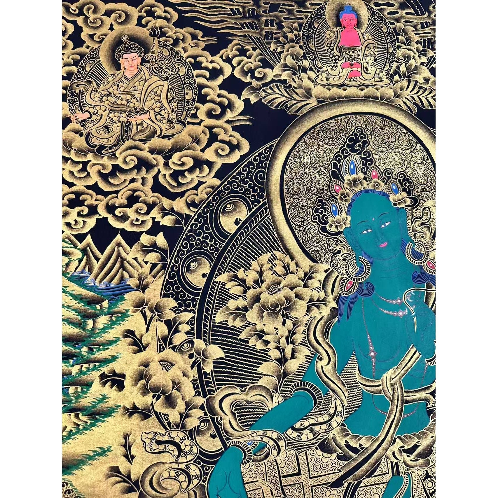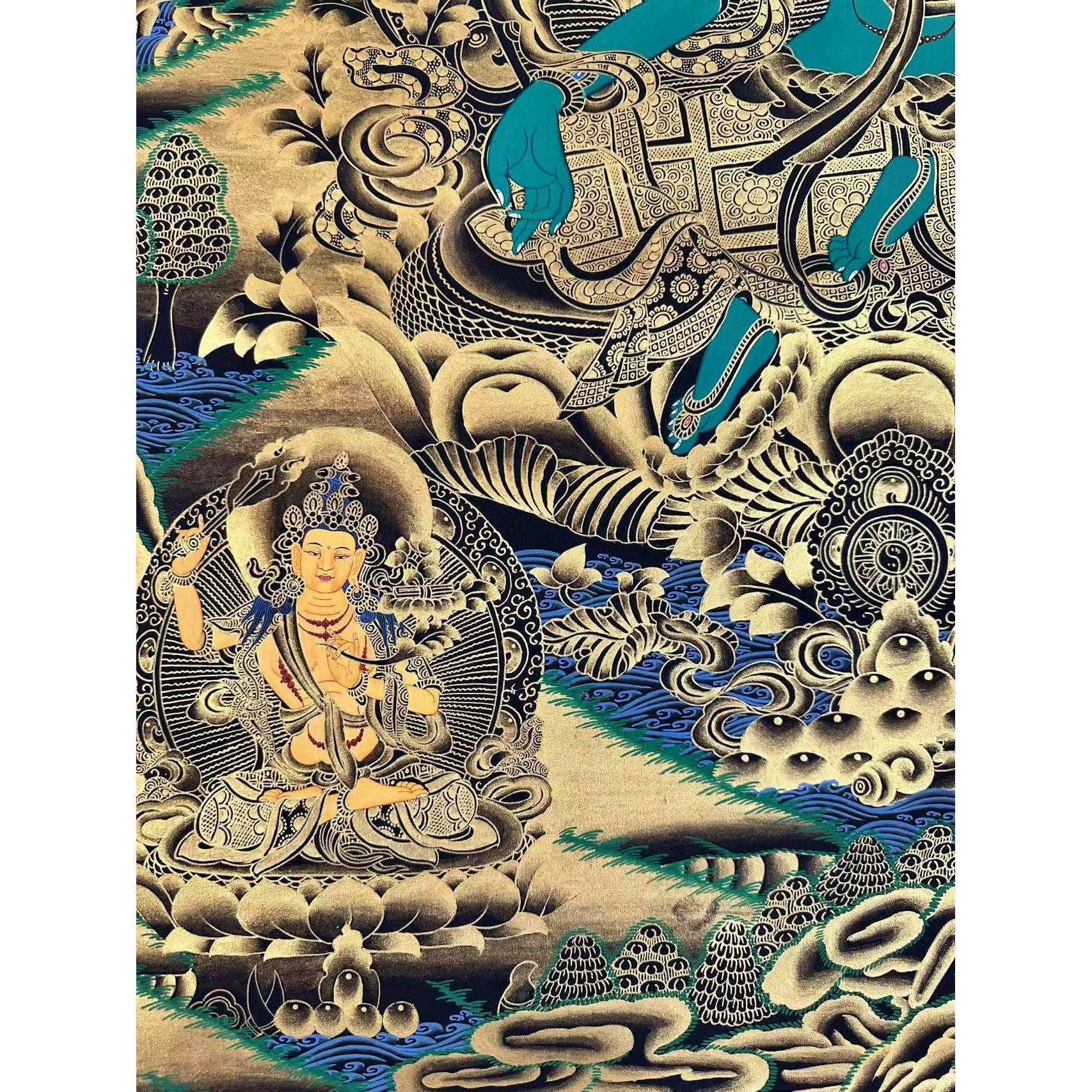 Elegant Art: Crafted with black and Tibetan gold dust, this Thangka enhances any space with its serene beauty and deep spiritual meaning.