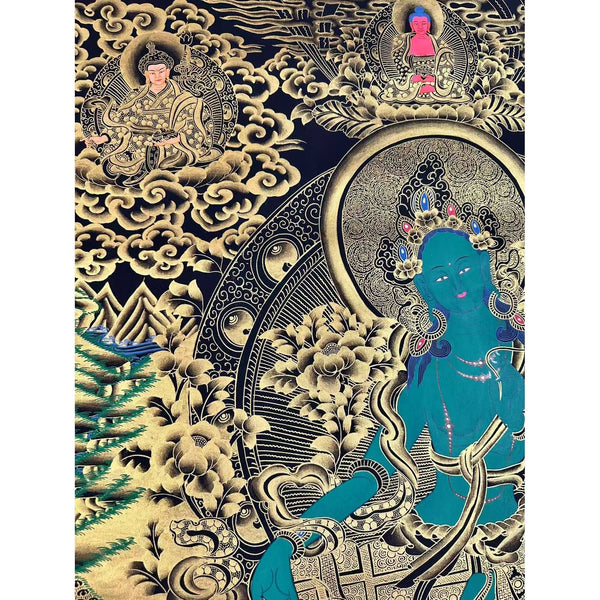 About Green Tara Thangka Art This Thangka painting depicts Green Tara, a Buddhist deity associated with enlightened activity and abundance. Green Tara is often regarded as a Bodhisattva or Buddha of compassion and action, a protector who relieves physical, emotional, and spiritual suffering. In Buddhism, her name, Tara, means "She Who Leads Across," referring to her role in liberating humanity from Samsara, the Ocean of Illusion.