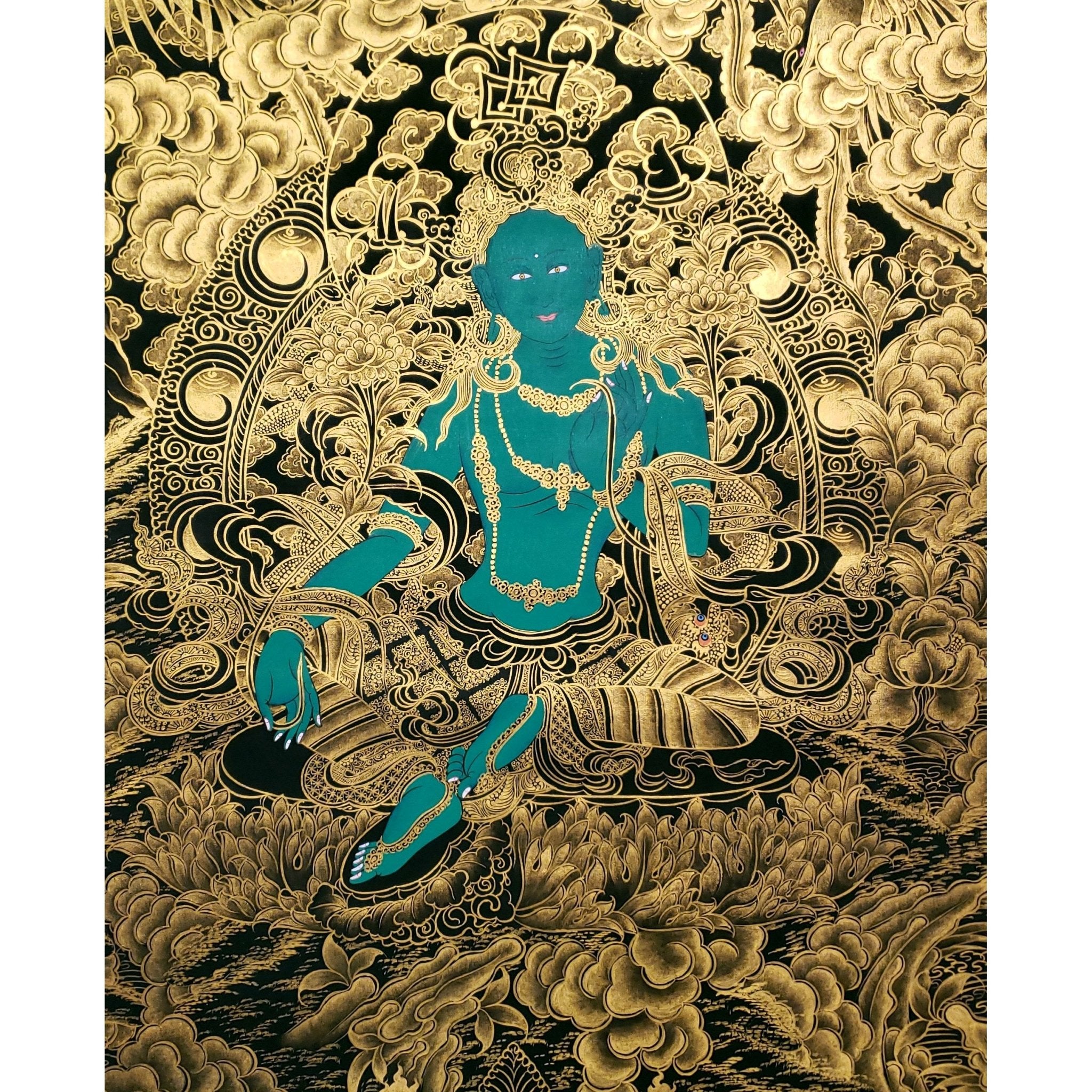 About Green Tara Thangka Art Green Tara is one of the most dynamic manifestations of Tara, symbolizing youthful vigor and activity. Her green color is linked with the Buddhist Lord of Karma, Amoghasiddhi, signifying their shared qualities of action. As a goddess of action, she is often depicted in a posture of readiness, with her right leg extended to signify her willingness to spring into action, while her left leg is folded in contemplation on the lotus pedestal, symbolizing the integration of wisdom and action.