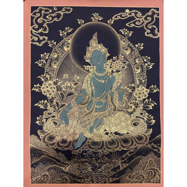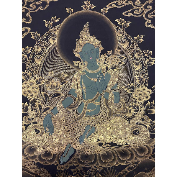 About Green Tara Thangka Art This Thangka painting depicts Green Tara, a Buddhist deity associated with enlightened activity and abundance. Green Tara is often regarded as a Bodhisattva or Buddha of compassion and action, a protector who relieves physical, emotional, and spiritual suffering. In Buddhism, her name, Tara, means "She Who Leads Across," referring to her role in liberating humanity from Samsara, the Ocean of Illusion.
