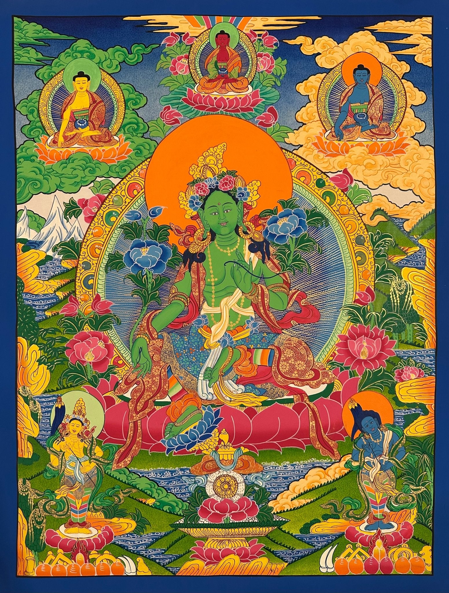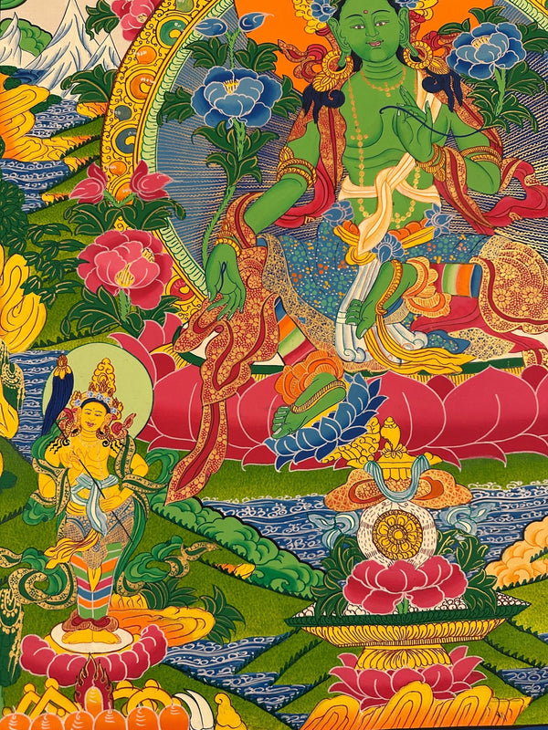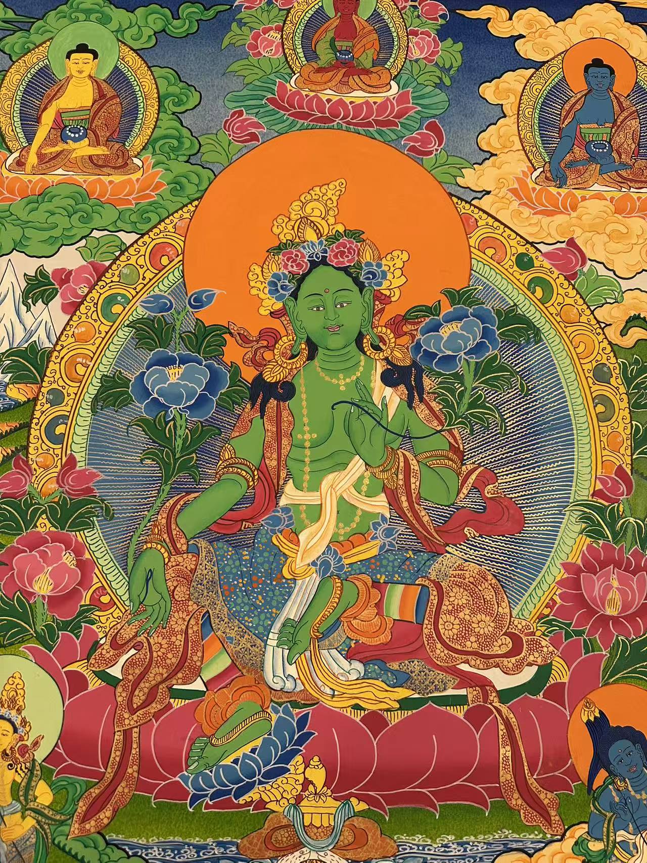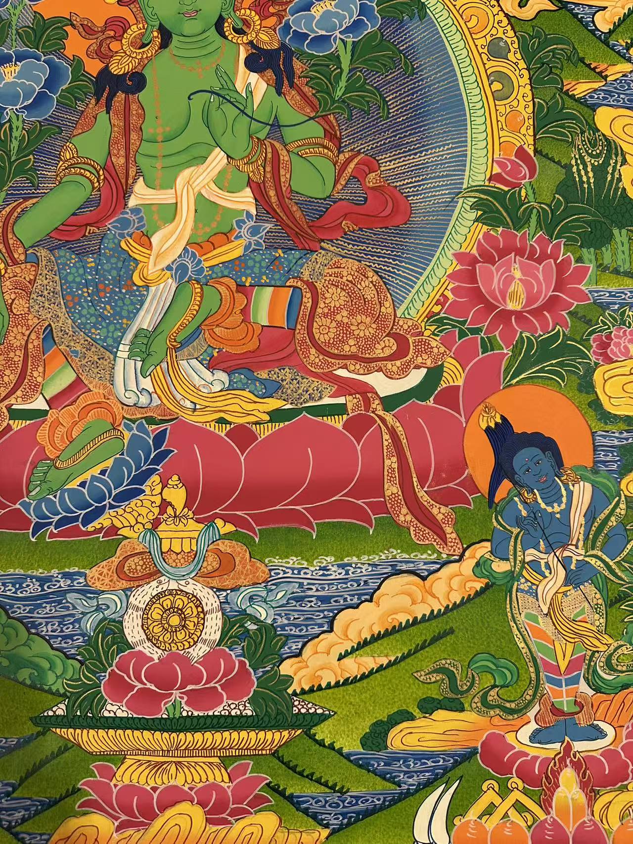 Cultural and Religious Depth: A meaningful portrayal of Green Tara, symbolizing her active compassion and protection.