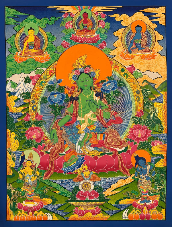 About Green Tara Thangka Art This Thangka painting depicts Green Tara, a Buddhist deity associated with enlightened activity and abundance. Green Tara is often regarded as a Bodhisattva or Buddha of compassion and action, a protector who relieves physical, emotional, and spiritual suffering. In Buddhism, her name, Tara, means "She Who Leads Across," referring to her role in liberating humanity from Samsara, the Ocean of Illusion.