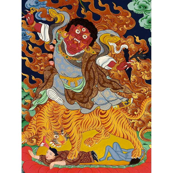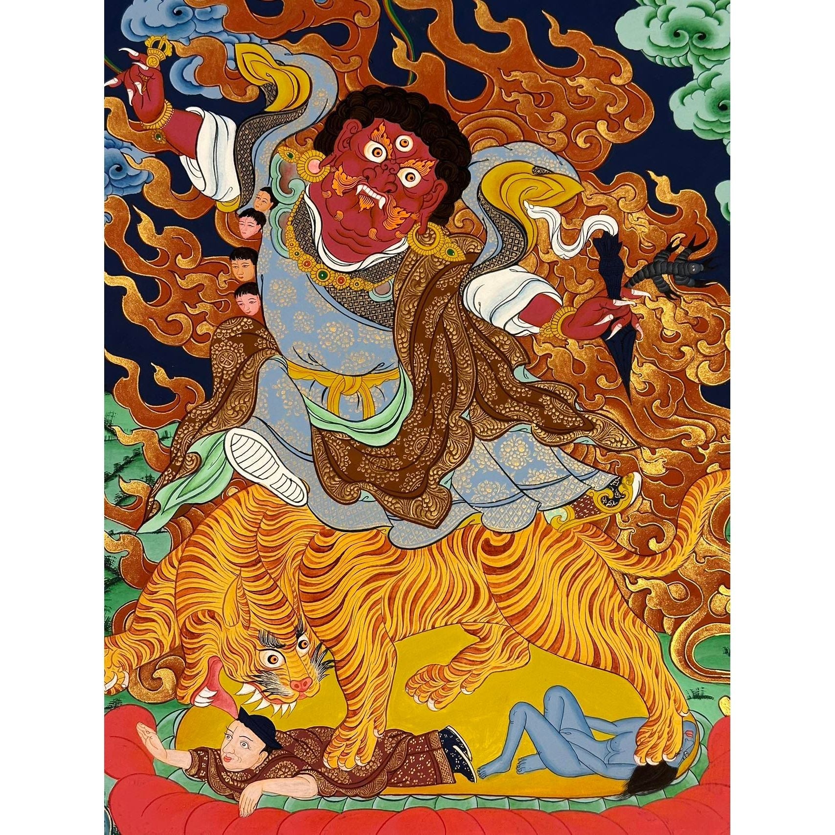 About Guru Dorje Drolo Thangka Art Guru Dorje Drolo is a wrathful manifestation of Guru Padmasambhava, one of the eight forms that he assumed to subdue negative forces. Dorje Drolo is known for his terrifying appearance, riding a tiger amidst a fiery blaze of pristine awareness, symbolizing his ability to destroy obstacles and negative energies.