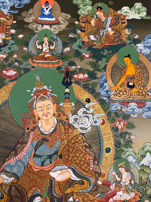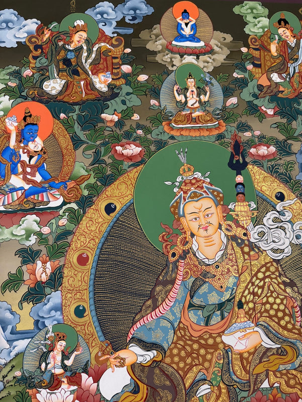 Rich Symbolism: The Thangka's intricate design captures the diverse nature of Guru Padmasambhava's transformative role in Buddhist practice.