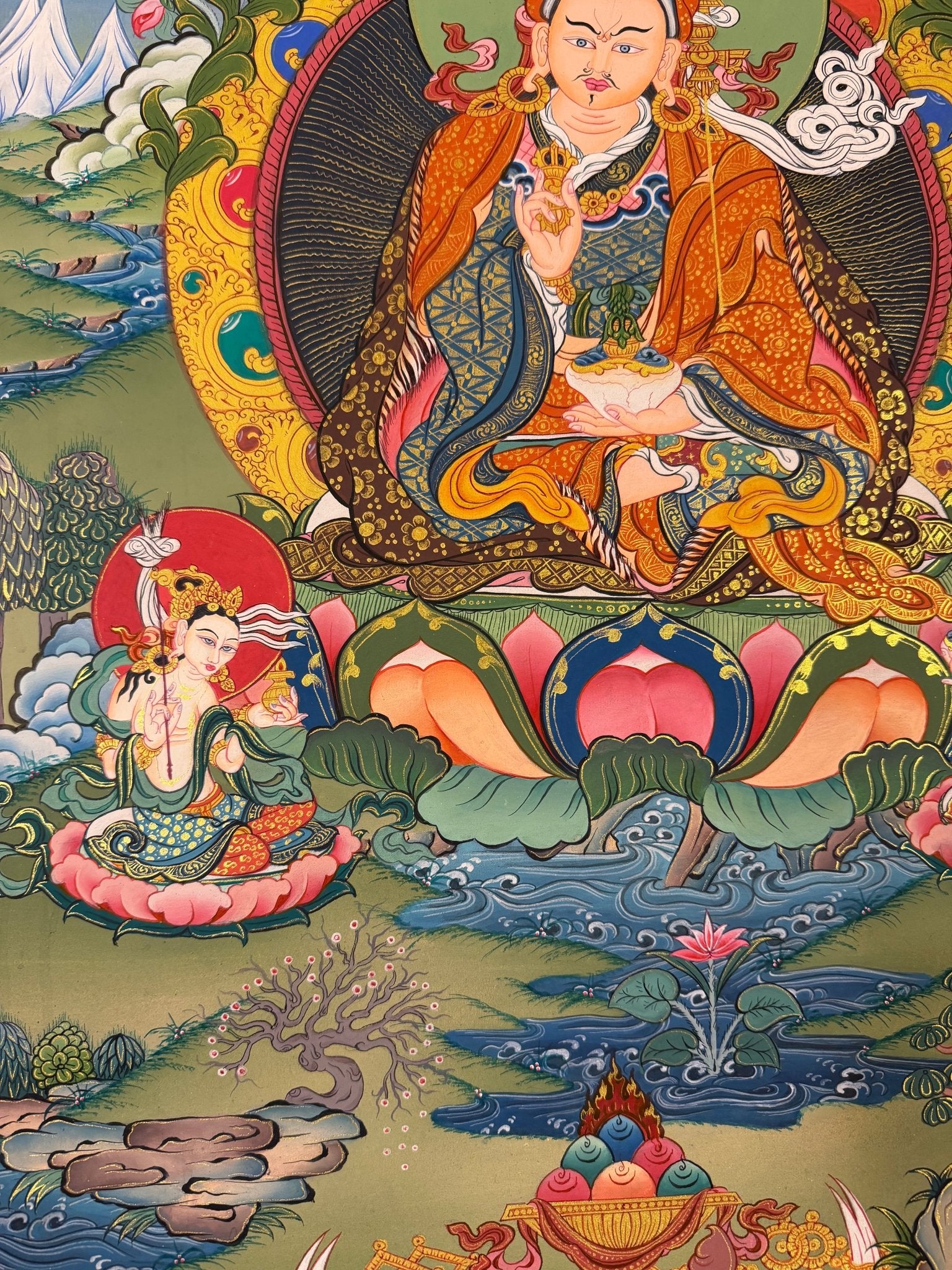 Invite the transformative energy of Guru Rinpoche into your life with this exquisite hand-painted masterpiece.