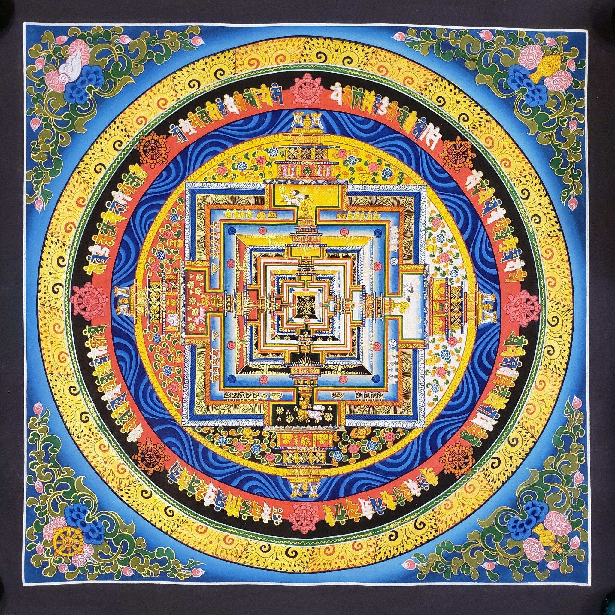 The Kalachakra Mandala Thangka is an exquisite and symbolic representation of the Kalachakra Tantra, one of the most advanced and complex teachings in Tibetan Buddhism. As His Holiness the Dalai Lama has emphasized, the Kalachakra initiations empower disciples to enter into the sacred Kalachakra mandala and identify with the deity Kalachakra. This hand-painted Thangka, created using Tibetan gold dust and natural pigments on organic cotton canvas, is a powerful tool for meditation and spiritual growth.