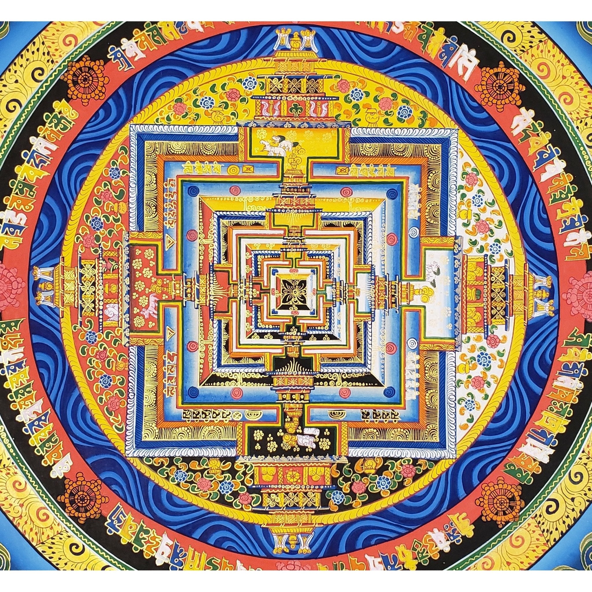Around the palace, four elemental rings (Earth, Water, Fire, and Wind) and two outer rings (Space and Wisdom) form a complete microcosm of the universe, ruled by Kalachakra, the embodiment of time.
