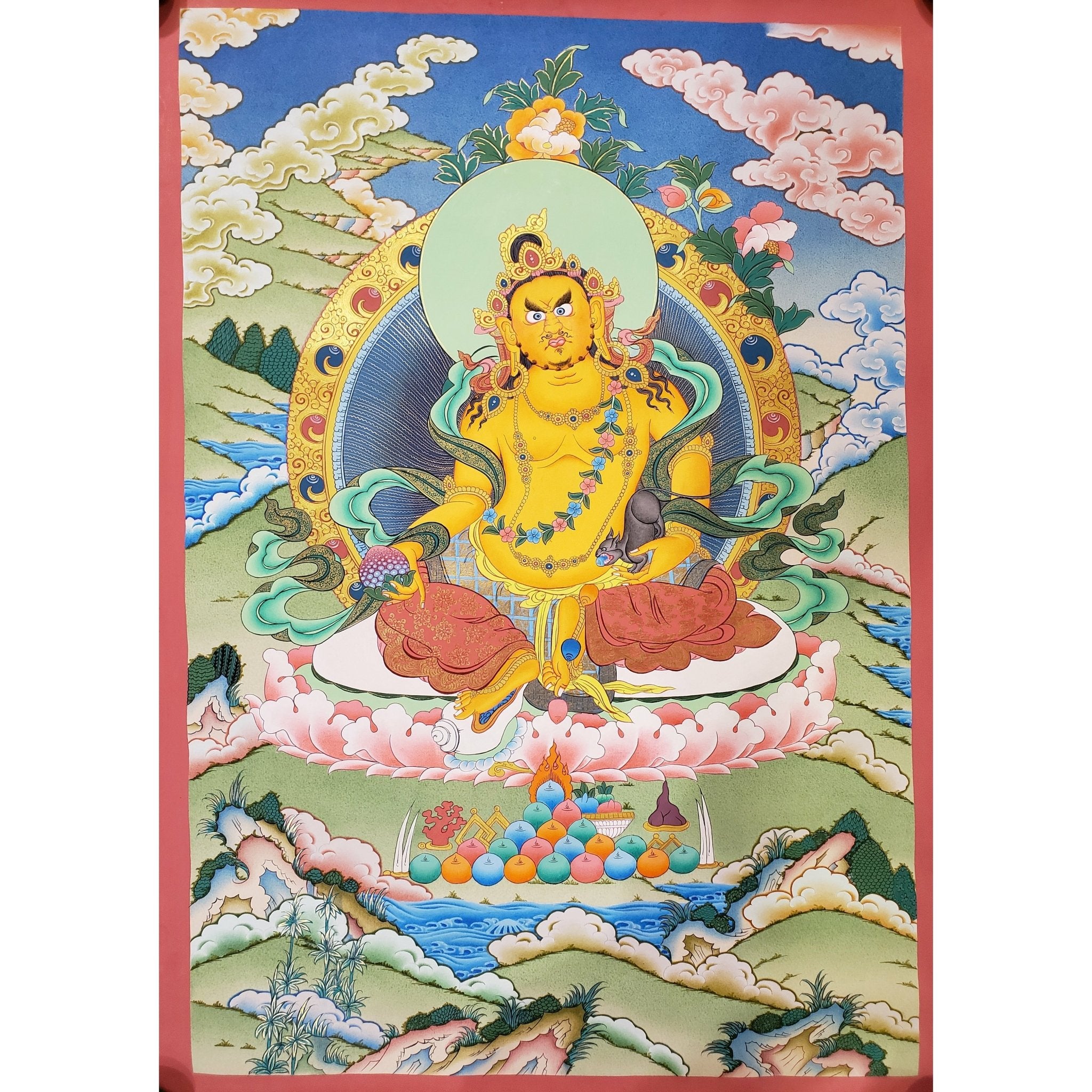 This 100% hand-painted Thangka, created in the Kathmandu Valley of Nepal, features Jambhala (Kubera), the revered God of Wealth and king of the semi-divine Yakshas. Meticulously crafted with Tibetan gold dust and traditional colors, it serves as a stunning wall hanging or spiritual centerpiece for your family altar, radiating prosperity and benevolence.