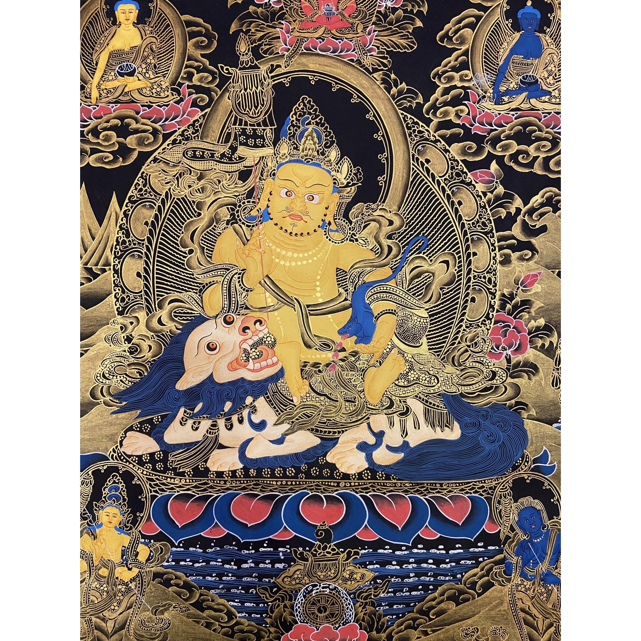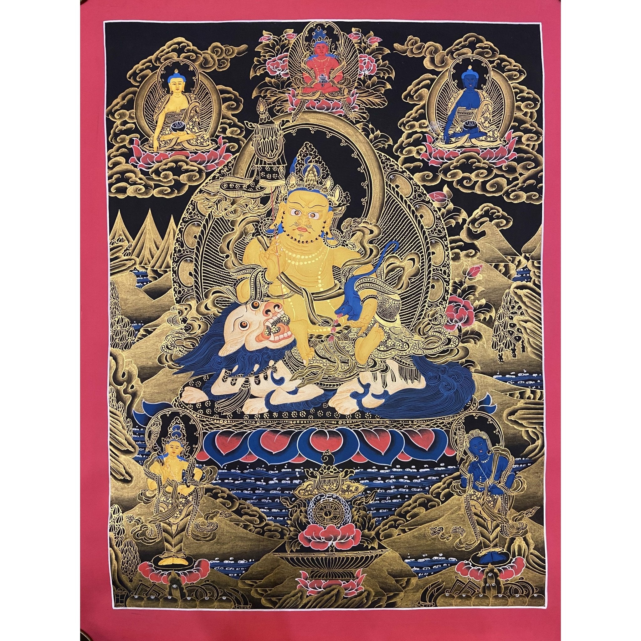 This 100% hand-painted Thangka, created in the Kathmandu Valley of Nepal, features Jambhala (Kubera), the revered God of Wealth and king of the semi-divine Yakshas. Meticulously crafted with Tibetan gold dust and traditional colors, it serves as a stunning wall hanging or spiritual centerpiece for your family altar, radiating prosperity and benevolence.