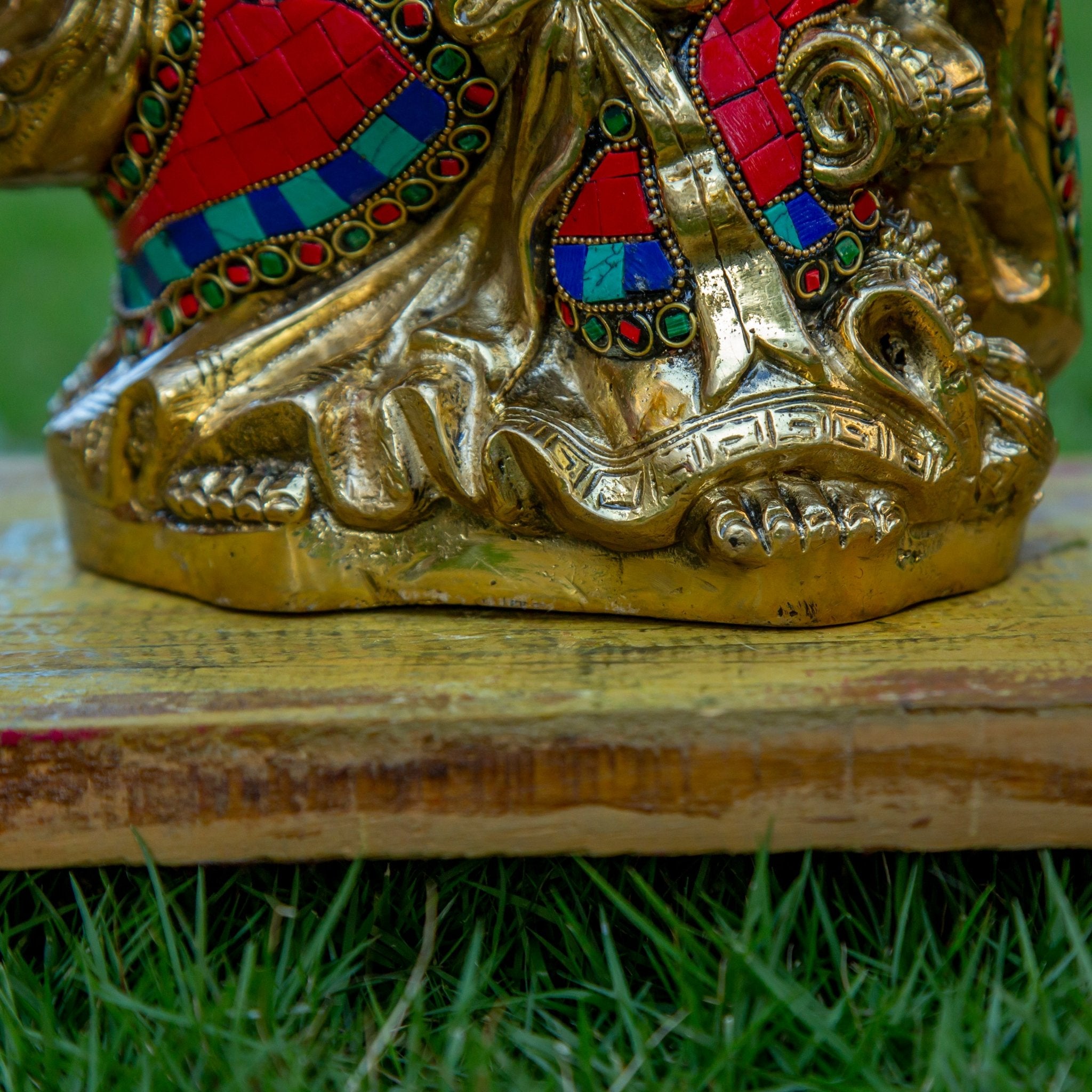 Handmade in Nepal, this statue combines playful symbolism with traditional craftsmanship, enhanced by semi-precious stone inlays that enrich its sacred and artistic value.