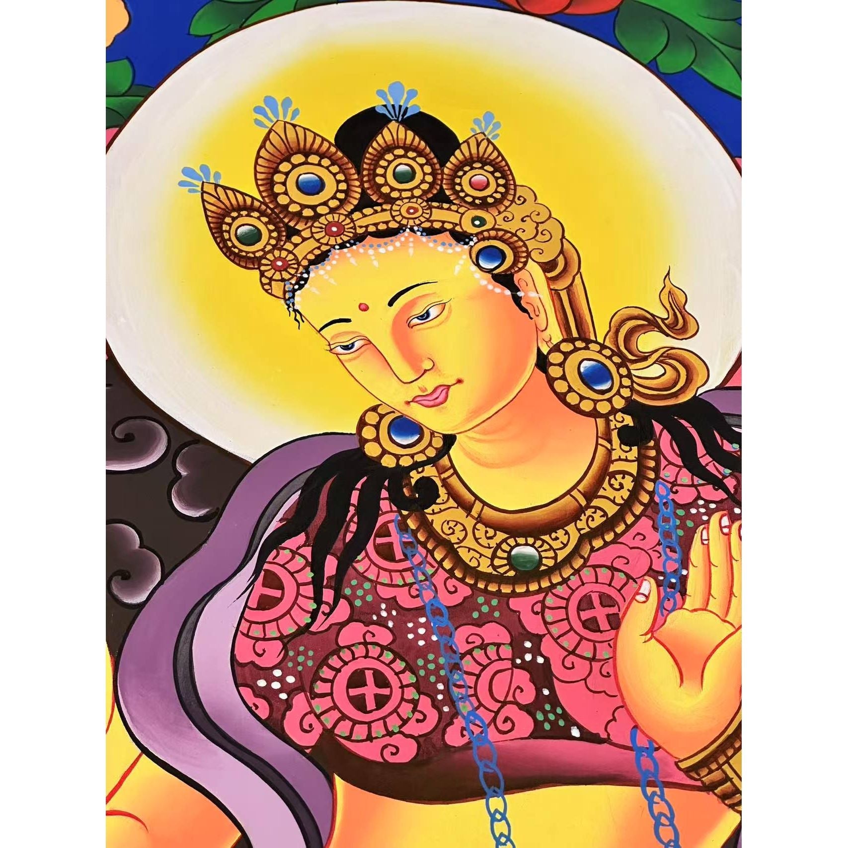 I have so much gratitude to the artist(s) and craftsfolk of this Thangka. The colors are vivid and stunning, even more beautiful in person than in the pictures. White Tara was radiant and soothing as soon as I opened the Thangka. She is exactly the energy I've been needing to connect with during a difficult time. I would be interested in knowing the names of the artist(s) if that is permitted? I would like to dedicate merit to them as well in appreciation.