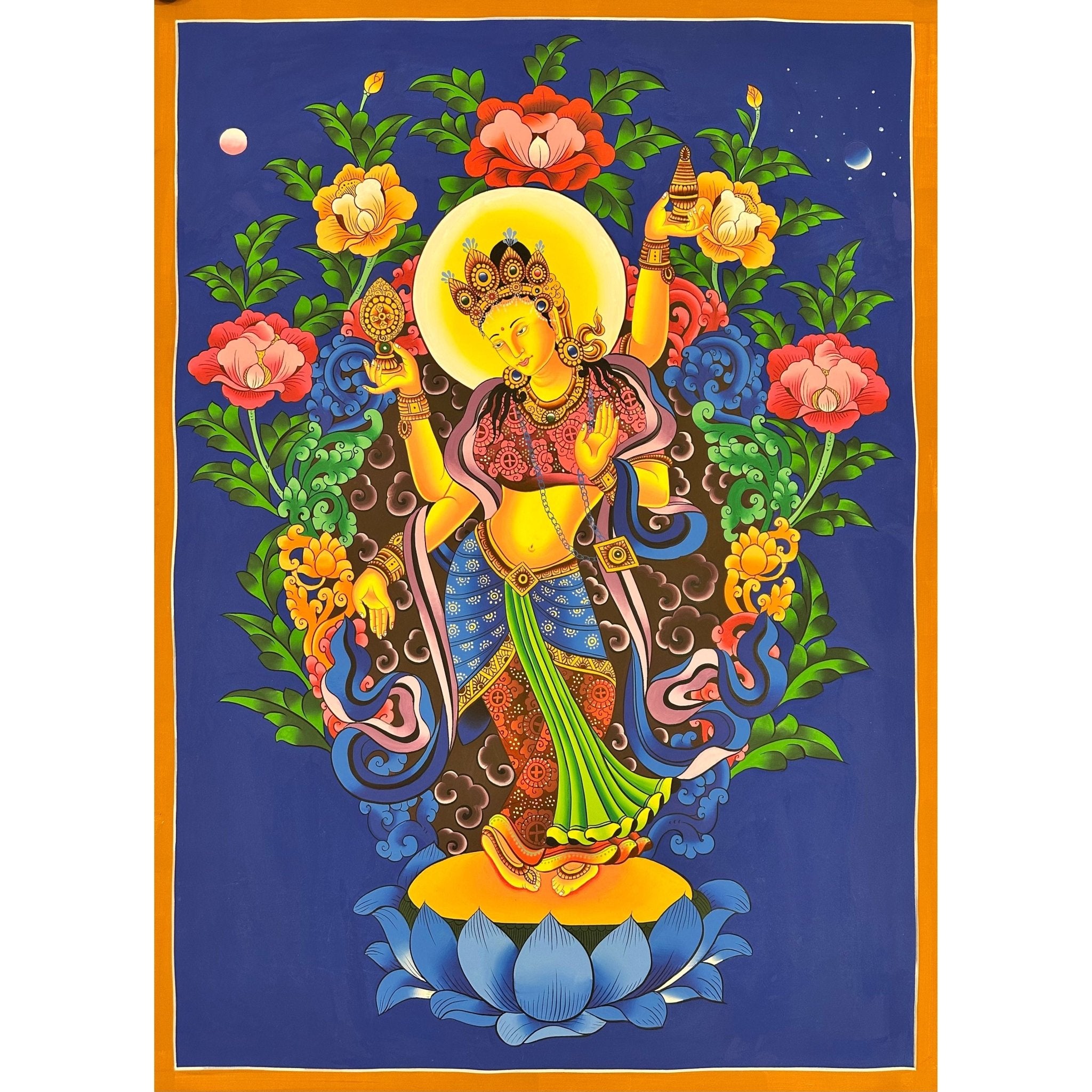This Thangka portrays Laxmi with four hands, each symbolizing an essential aspect of prosperity: dharma (righteousness), artha (wealth), kama (desires), and moksha (liberation). She holds a lotus flower, signifying purity and divine wisdom, while golden coins flow from her palm, representing an endless source of wealth and blessings. The two elephants surrounding her symbolize royalty and unceasing prosperity.