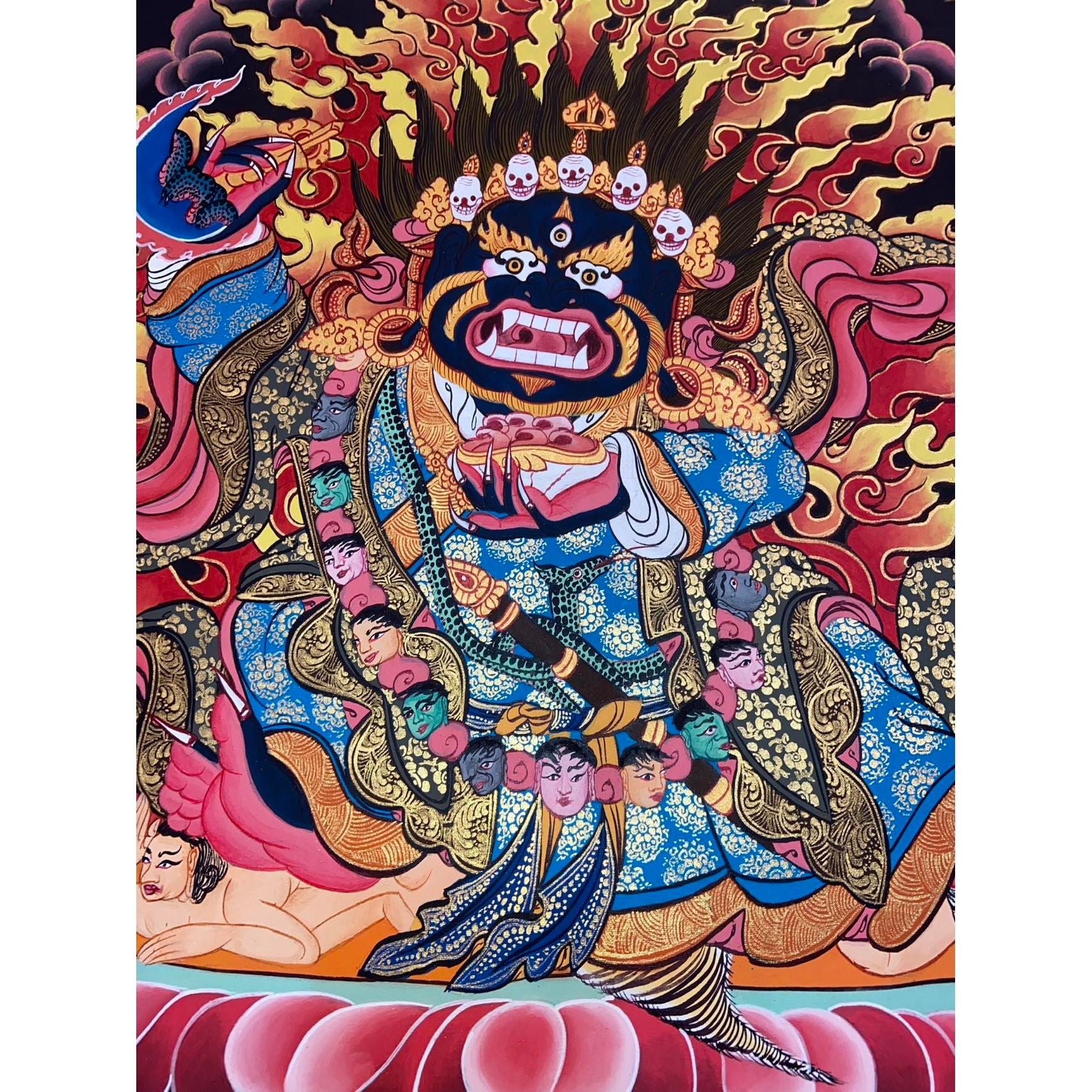 While Mahakala appears ferocious, he is ultimately a manifestation of Avalokiteshvara, the Bodhisattva of compassion, and his actions are rooted in the compassionate intention to help sentient beings overcome suffering and attain enlightenment.