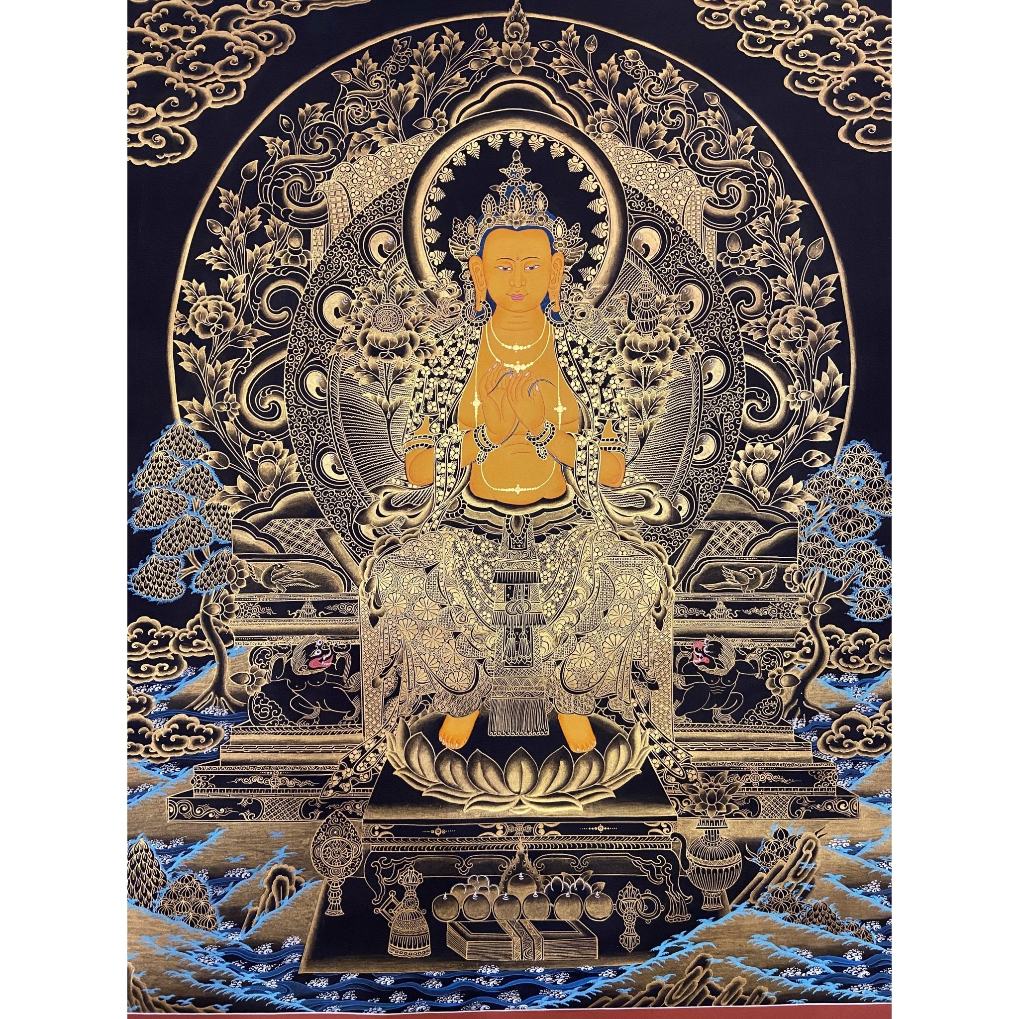 - Dharma Teachings: The Dharma wheel and water flask symbolize his role in spreading pure teachings for the benefit of all beings.