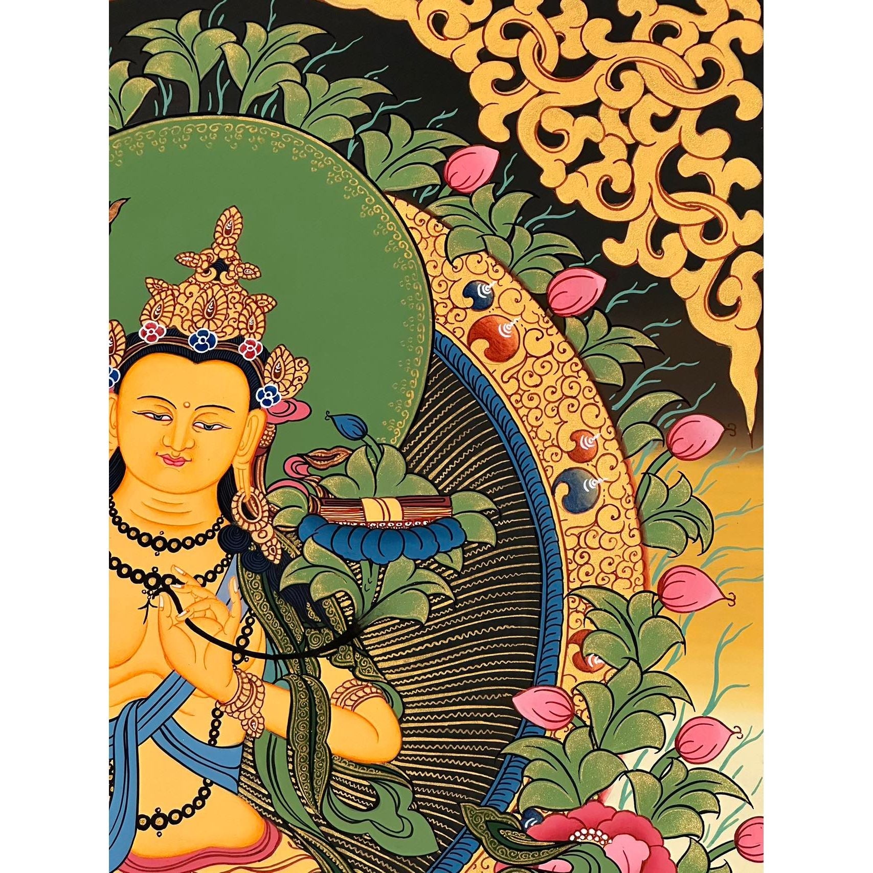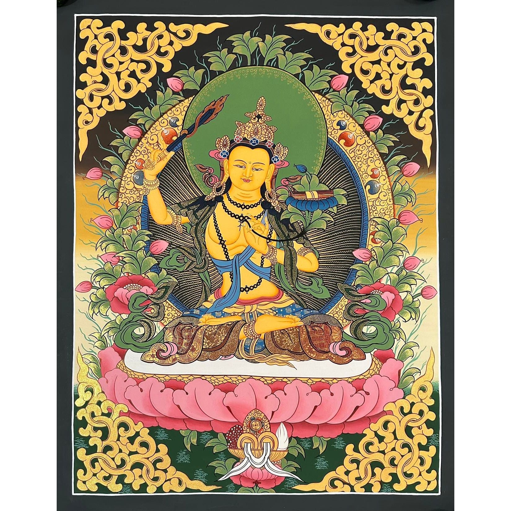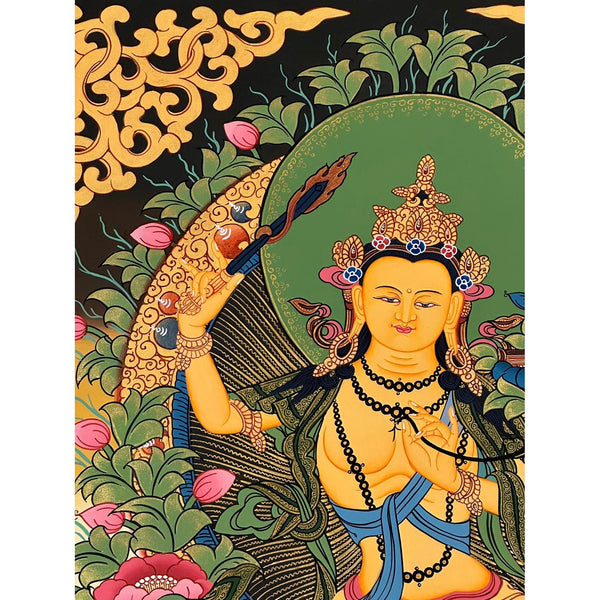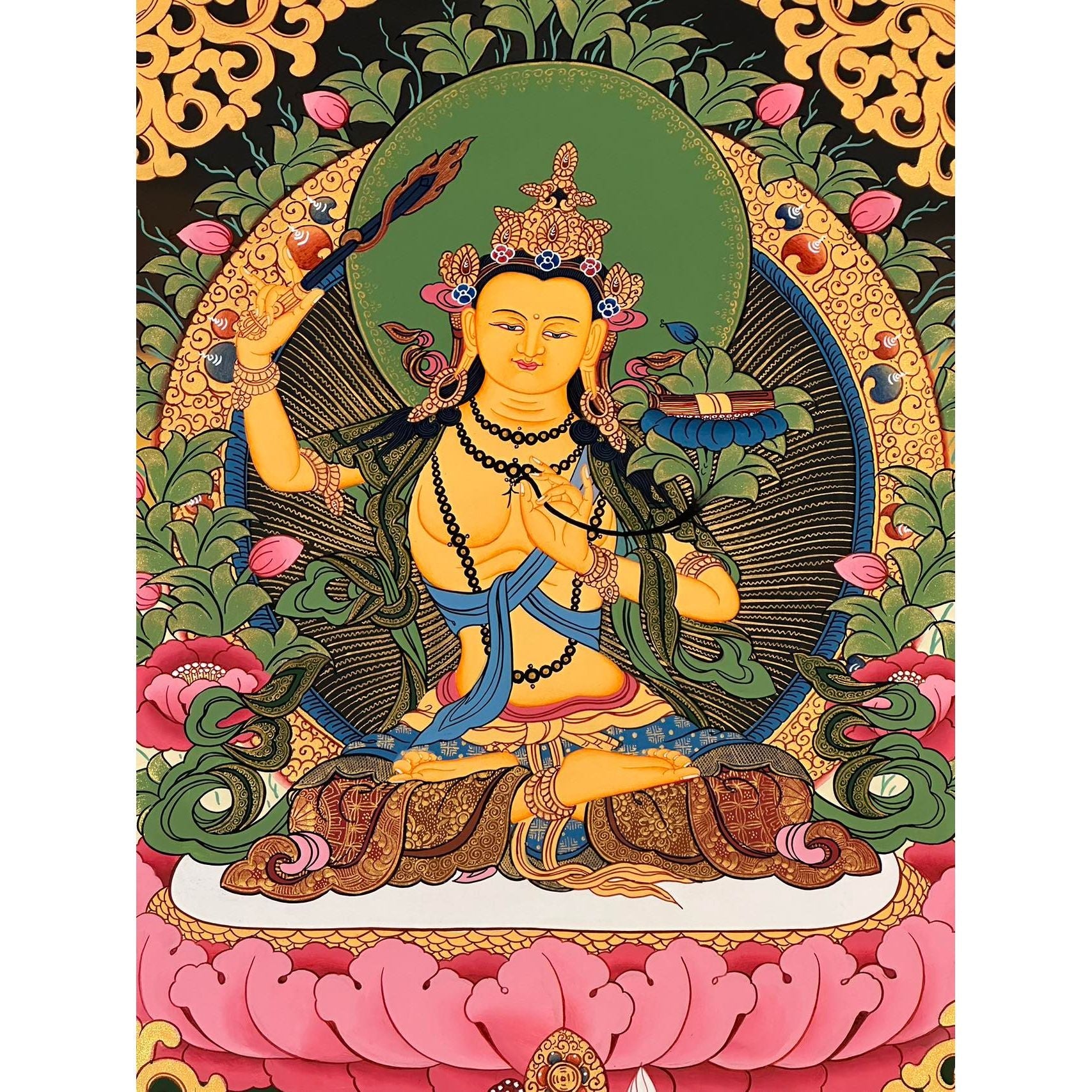 Manjushri’s image serves as a constant reminder to cultivate wisdom and enlightenment. Displaying this Thangka invites the qualities of knowledge and purity into your life, inspiring spiritual growth and clarity.
