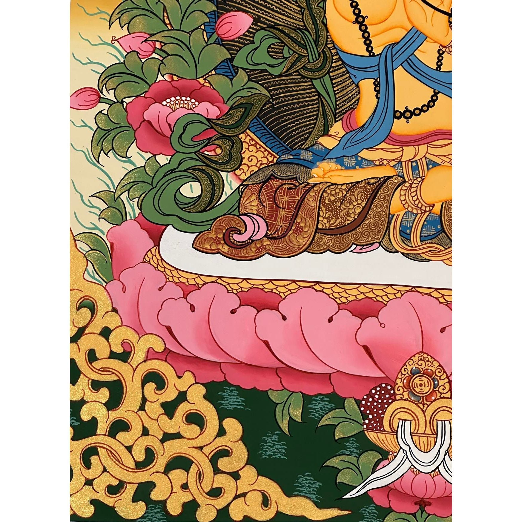 This 100% hand-drawn Thangka, crafted with dedication in the Kathmandu Valley, Nepal, is perfect for various home décor ideas. Whether as an elegant centerpiece in your home or office or as a sacred piece on your family altar, this Thangka brings both aesthetic and spiritual value. It attracts the benevolent energy of Tibetan Buddhist art, enhancing meditation, emotional healing, and spiritual growth.