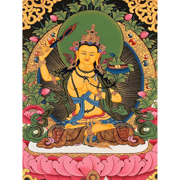 In this Thangka, Manjushri's golden skin radiates multi-colored rays, symbolizing the many paths through which he leads others to wisdom. The sword in his right hand represents the knowledge that cuts through ignorance, clearing the minds of unenlightened beings. In his left hand, he holds a sutra, representing the sacred teachings that instill wisdom and ignite the journey toward omniscience.
