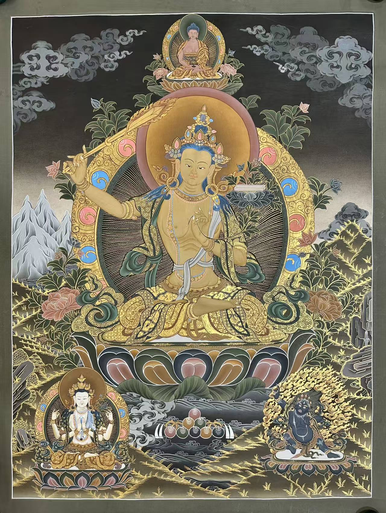 Surrounding Manjushri are flowers, symbolizing his purity. Just as a flower emerges untainted from the mud, Manjushri is free from the faults he once carried as an ordinary being. He is often depicted in a triad with Avalokiteshvara and Vajrapani, known as Rigsum Gonpo, embodying the essential qualities for enlightenment: compassion, wisdom, and power.