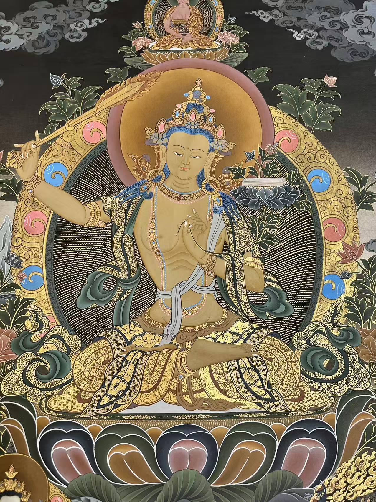 In this Thangka, Manjushri's golden skin radiates multi-colored rays, symbolizing the many paths through which he leads others to wisdom. The sword in his right hand represents the knowledge that cuts through ignorance, clearing the minds of unenlightened beings. In his left hand, he holds a sutra, representing the sacred teachings that instill wisdom and ignite the journey toward omniscience.