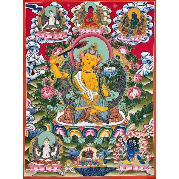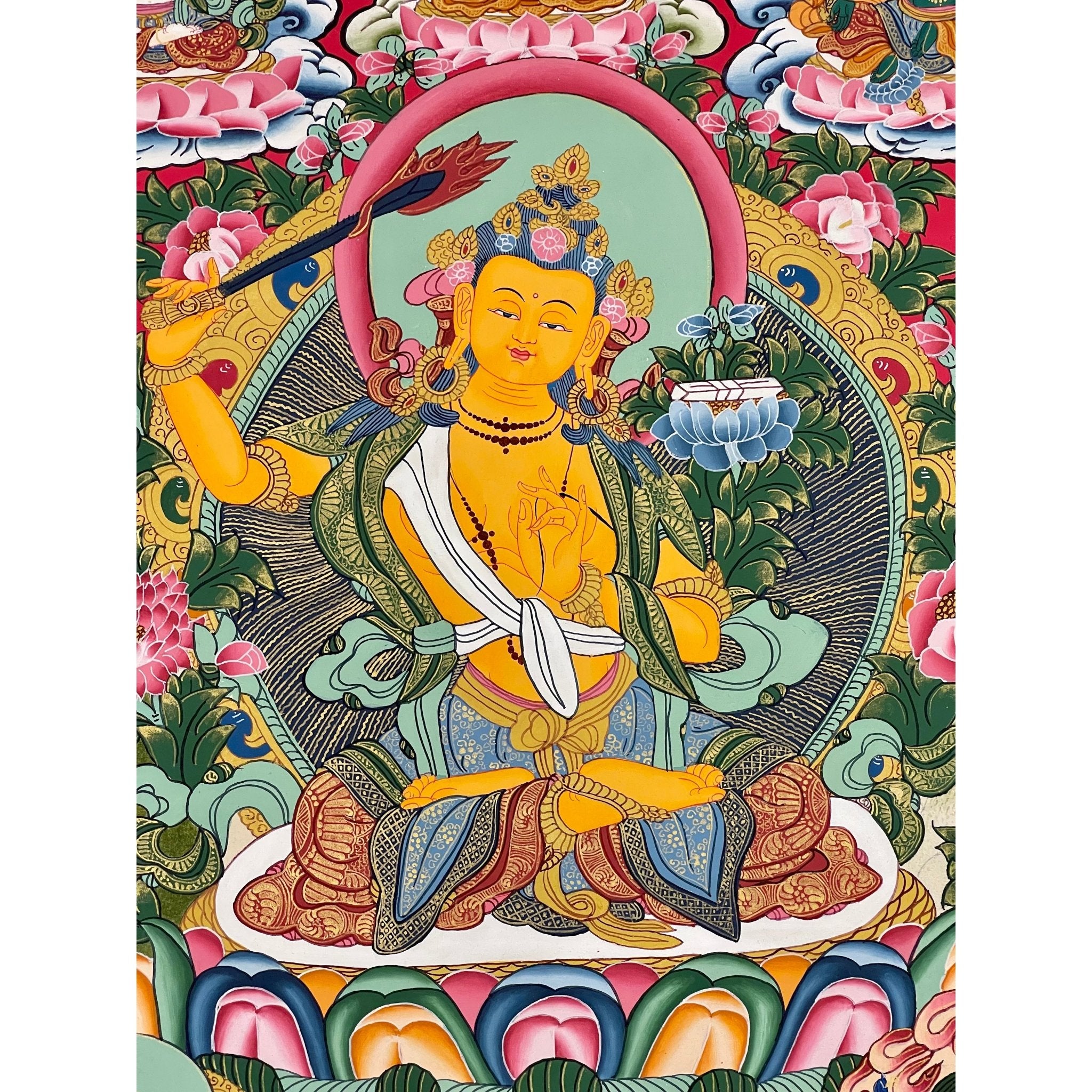 In this Thangka, Manjushri's golden skin radiates multi-colored rays, symbolizing the many paths through which he leads others to wisdom. The sword in his right hand represents the knowledge that cuts through ignorance, clearing the minds of unenlightened beings. In his left hand, he holds a sutra, representing the sacred teachings that instill wisdom and ignite the journey toward omniscience.