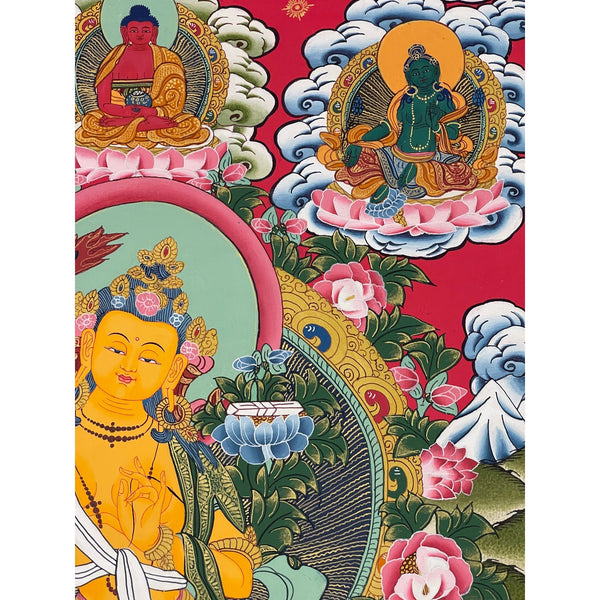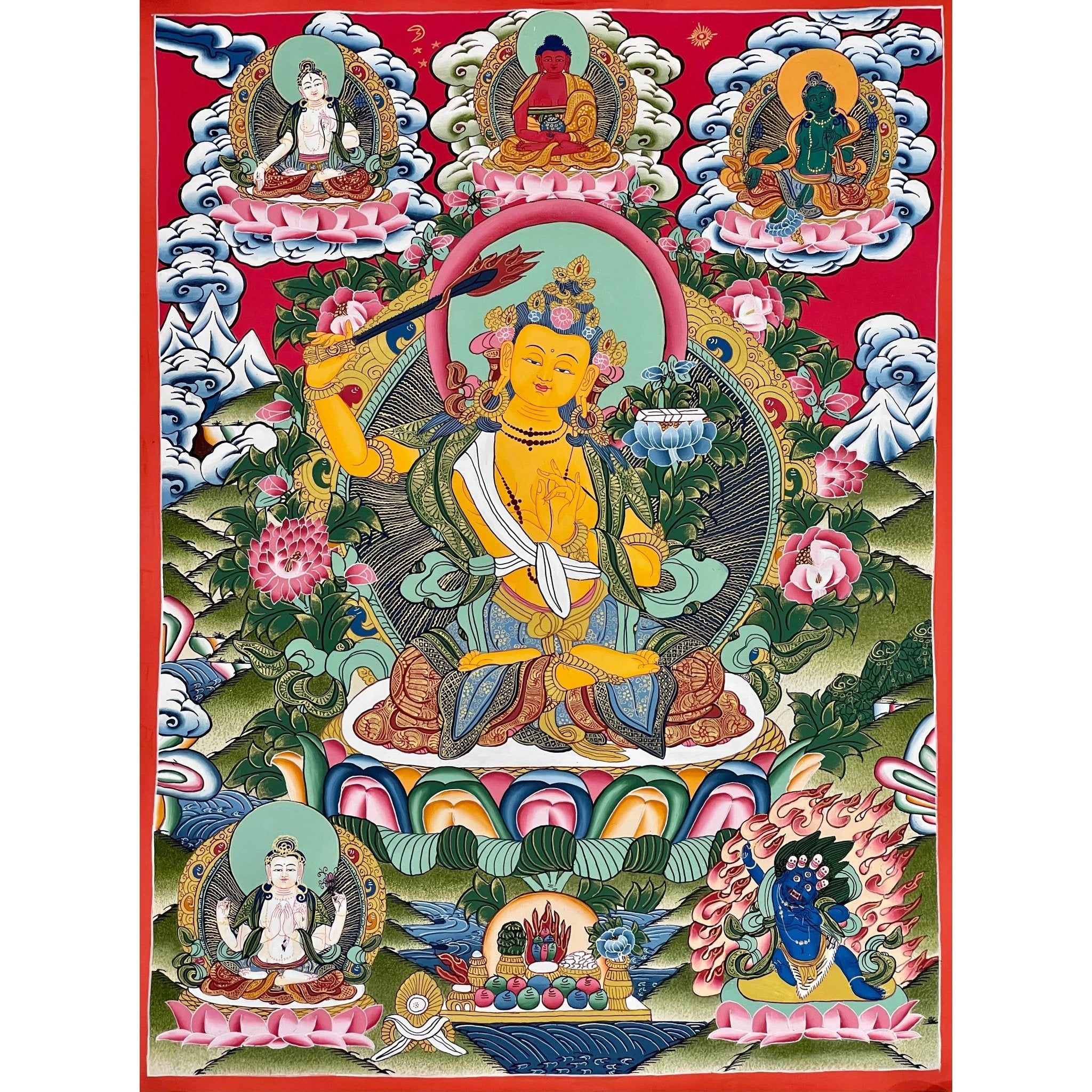Manjushri’s image serves as a constant reminder to cultivate wisdom and enlightenment. Displaying this Thangka invites the qualities of knowledge and purity into your life, inspiring spiritual growth and clarity.
