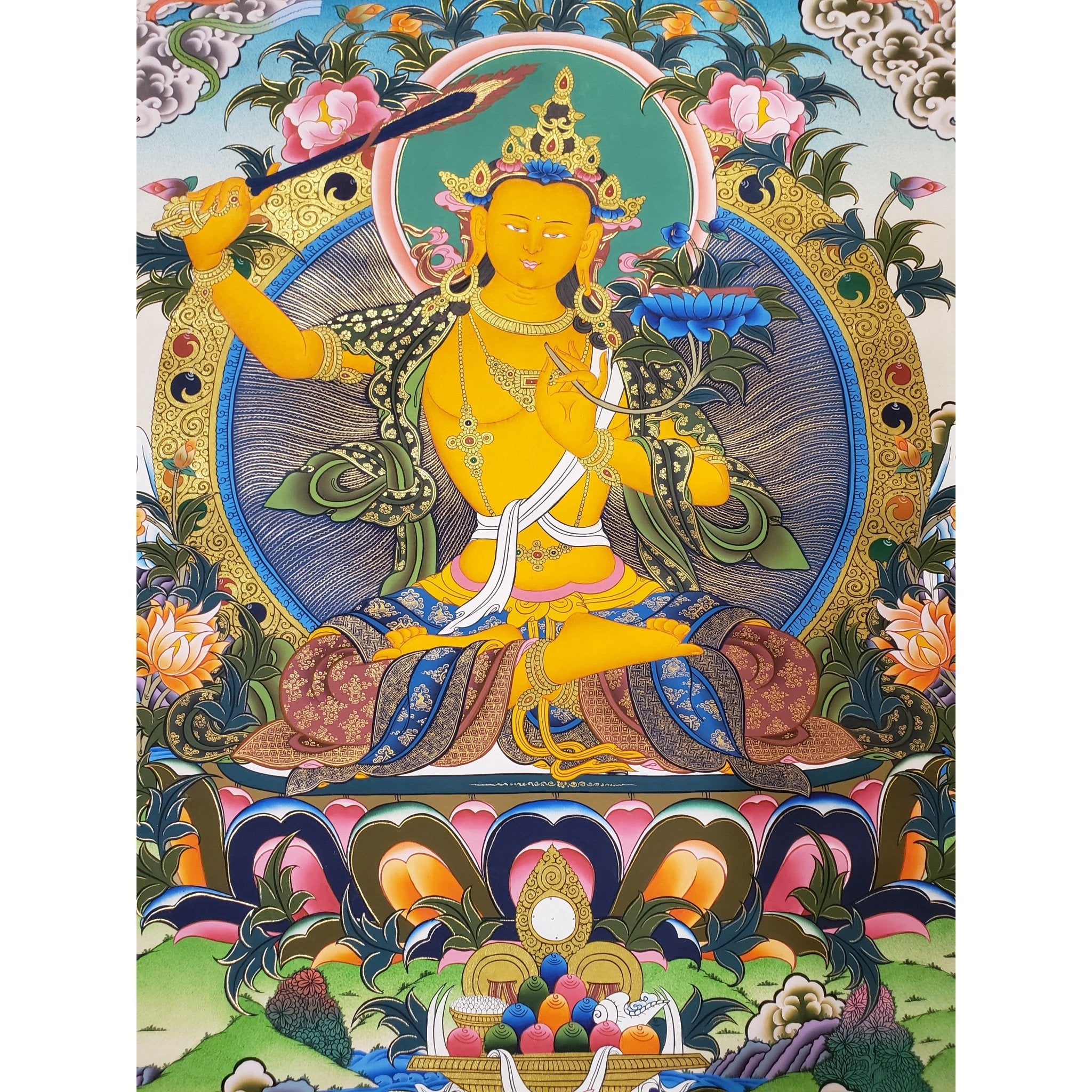 In this Thangka, Manjushri's golden skin radiates multi-colored rays, symbolizing the many paths through which he leads others to wisdom. The sword in his right hand represents the knowledge that cuts through ignorance, clearing the minds of unenlightened beings. In his left hand, he holds a sutra, representing the sacred teachings that instill wisdom and ignite the journey toward omniscience.