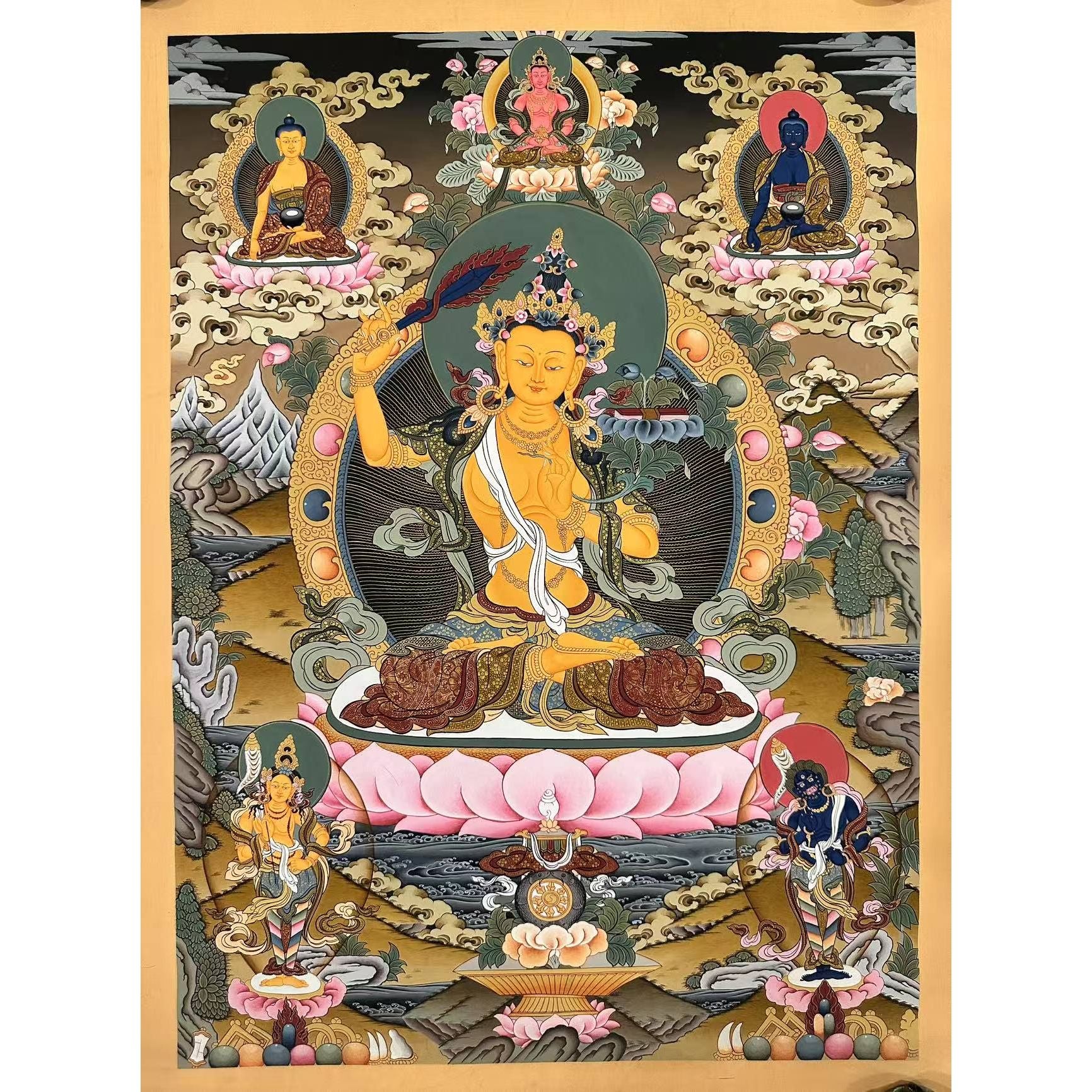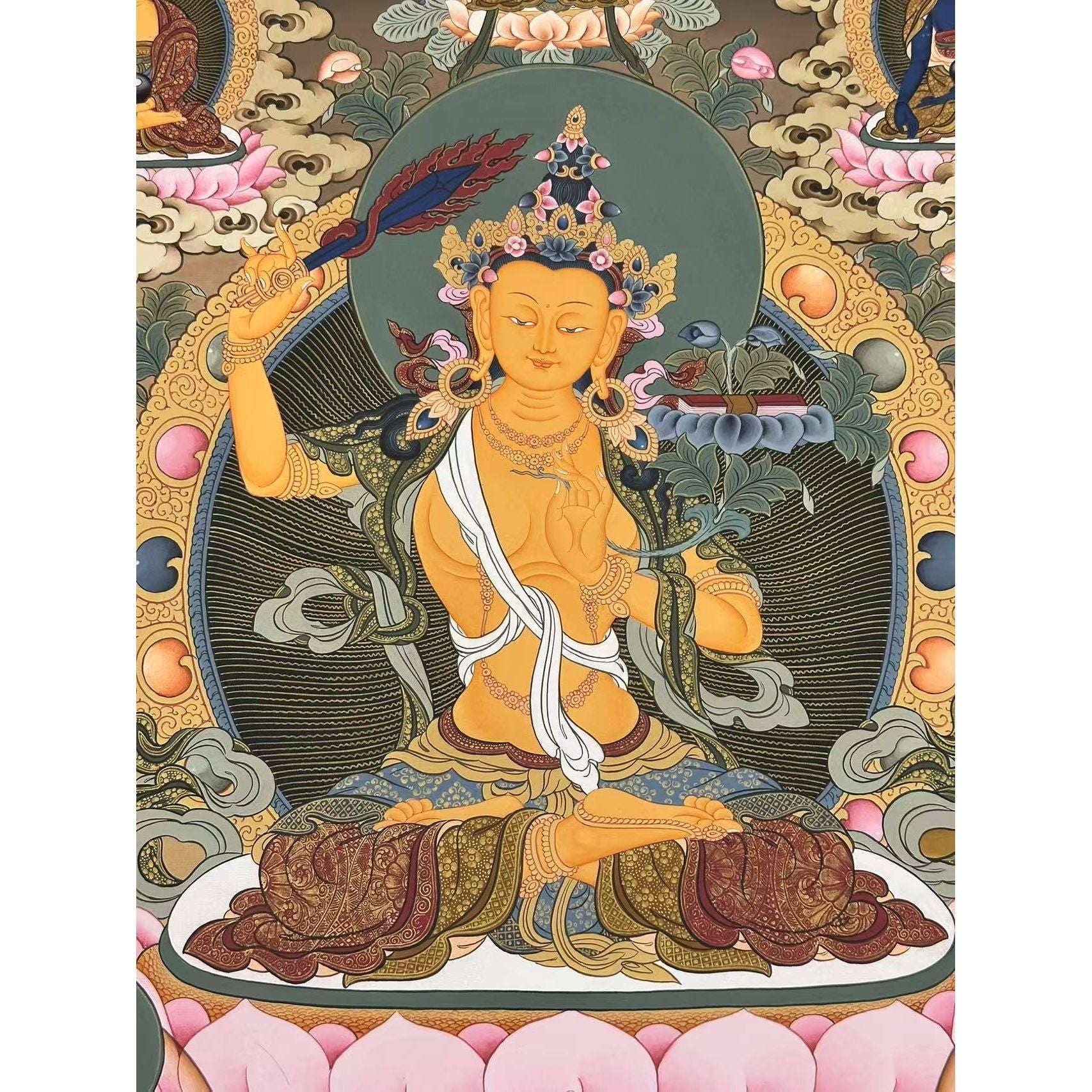 In this Thangka, Manjushri's golden skin radiates multi-colored rays, symbolizing the many paths through which he leads others to wisdom. The sword in his right hand represents the knowledge that cuts through ignorance, clearing the minds of unenlightened beings. In his left hand, he holds a sutra, representing the sacred teachings that instill wisdom and ignite the journey toward omniscience.