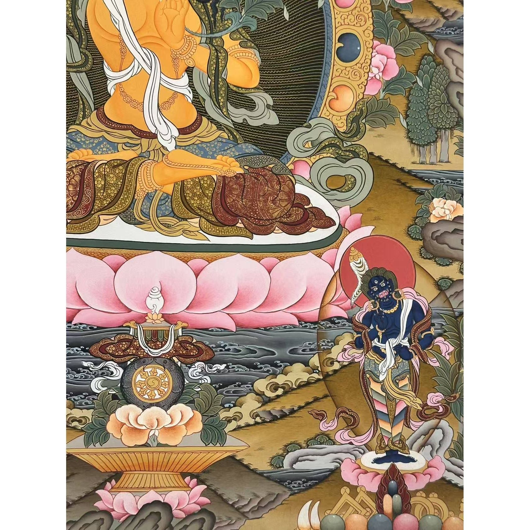 This 100% hand-drawn Thangka, crafted with dedication in the Kathmandu Valley, Nepal, is perfect for various home décor ideas. Whether as an elegant centerpiece in your home or office or as a sacred piece on your family altar, this Thangka brings both aesthetic and spiritual value. It attracts the benevolent energy of Tibetan Buddhist art, enhancing meditation, emotional healing, and spiritual growth.