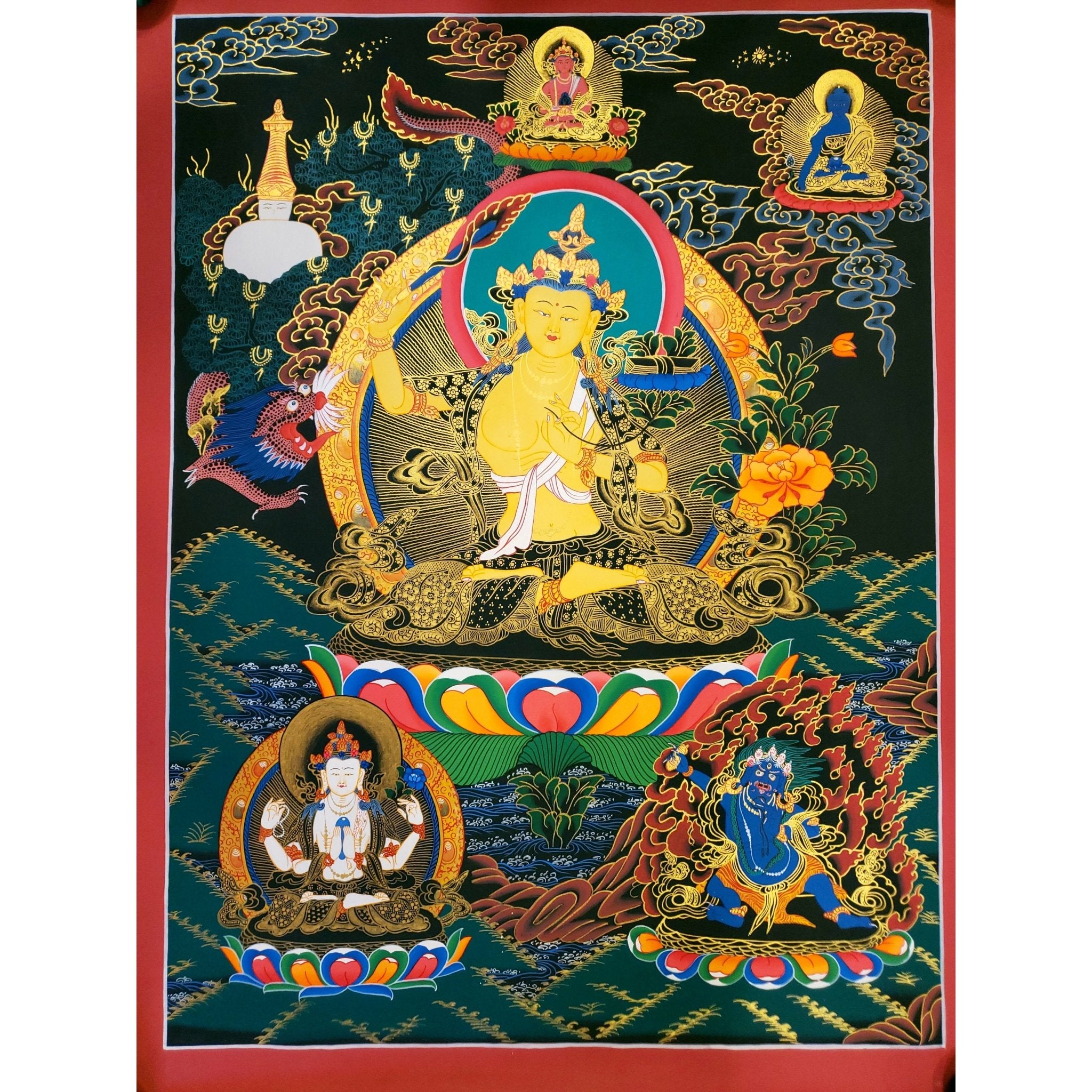 Manjushri’s image serves as a constant reminder to cultivate wisdom and enlightenment. Displaying this Thangka invites the qualities of knowledge and purity into your life, inspiring spiritual growth and clarity.