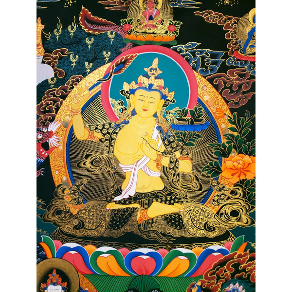 In this Thangka, Manjushri's golden skin radiates multi-colored rays, symbolizing the many paths through which he leads others to wisdom. The sword in his right hand represents the knowledge that cuts through ignorance, clearing the minds of unenlightened beings. In his left hand, he holds a sutra, representing the sacred teachings that instill wisdom and ignite the journey toward omniscience.