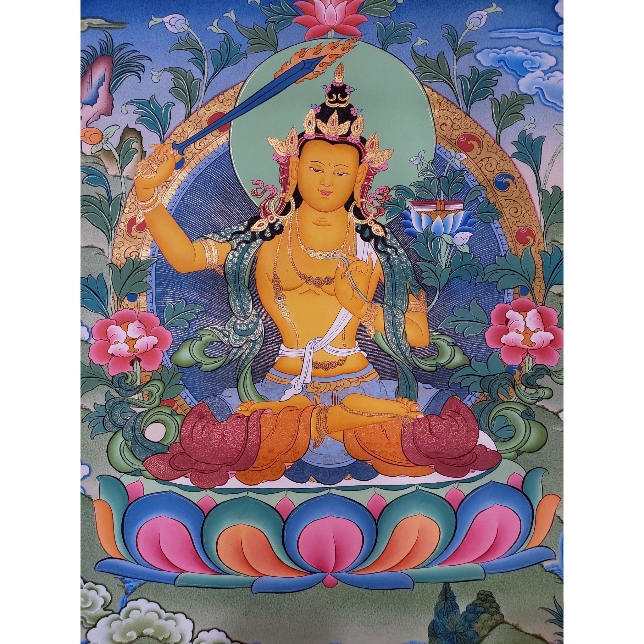 Manjushri’s image serves as a constant reminder to cultivate wisdom and enlightenment. Displaying this Thangka invites the qualities of knowledge and purity into your life, inspiring spiritual growth and clarity.