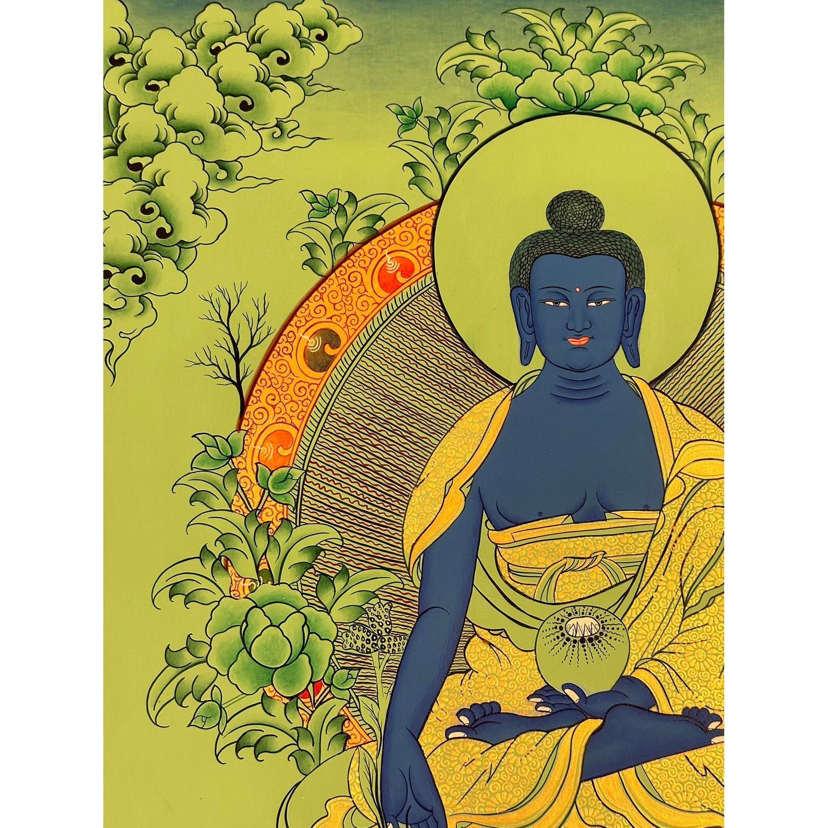 In Mahayana Buddhism, Medicine Buddha, known as Bhaisajyaguru in Sanskrit, is revered for his ability to promote healing, compassion, and the elimination of suffering. His resplendent blue form symbolizes his role as a compassionate healer, offering blessings for wellness, good health, and the alleviation of physical, mental, and spiritual afflictions. Through the power of healing meditations and recitation of his mantra, Medicine Buddha is believed to help purify suffering and bring balance to the mind, body, and spirit.