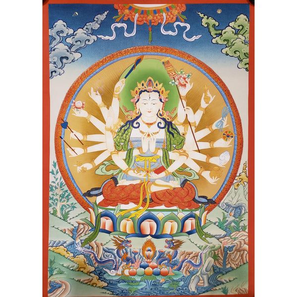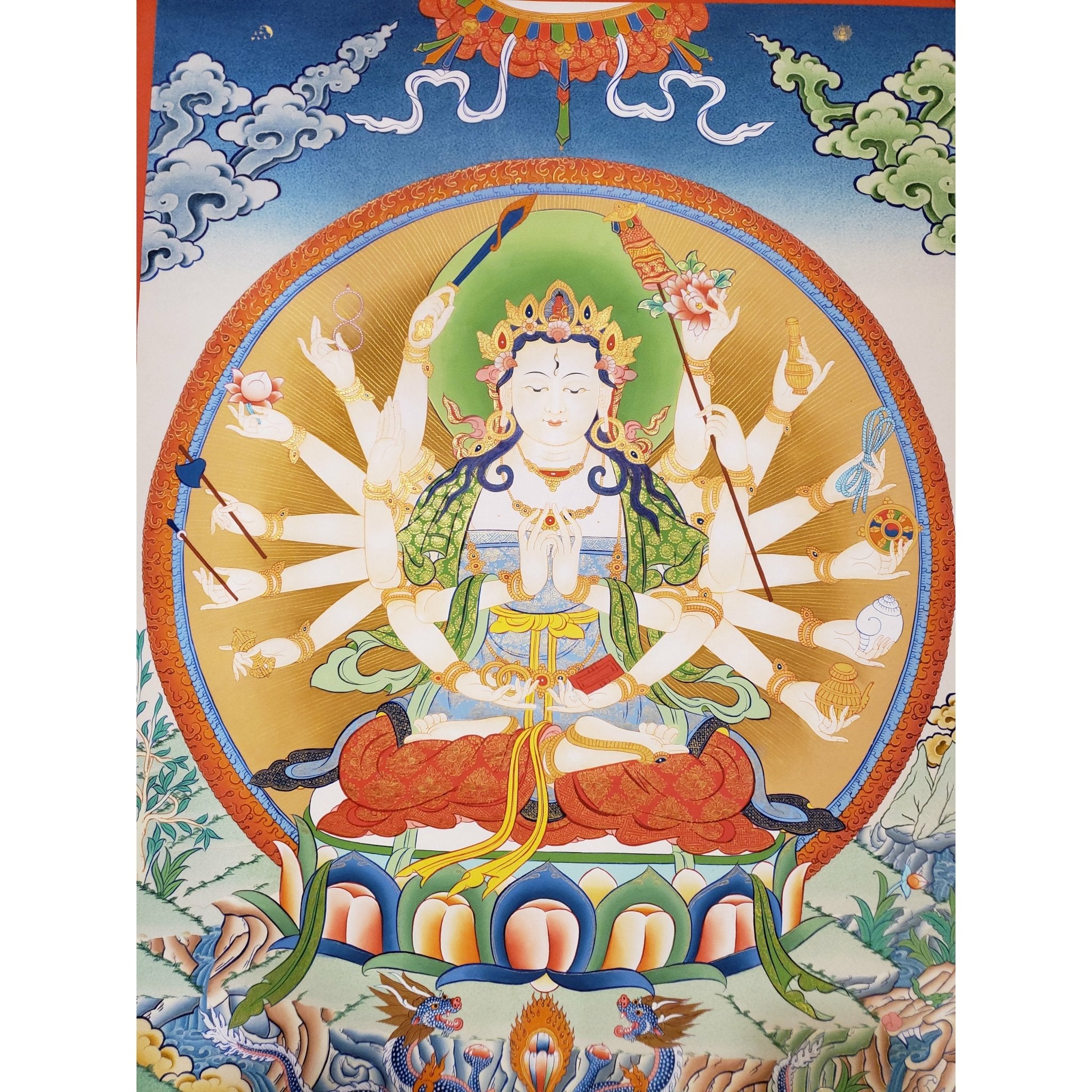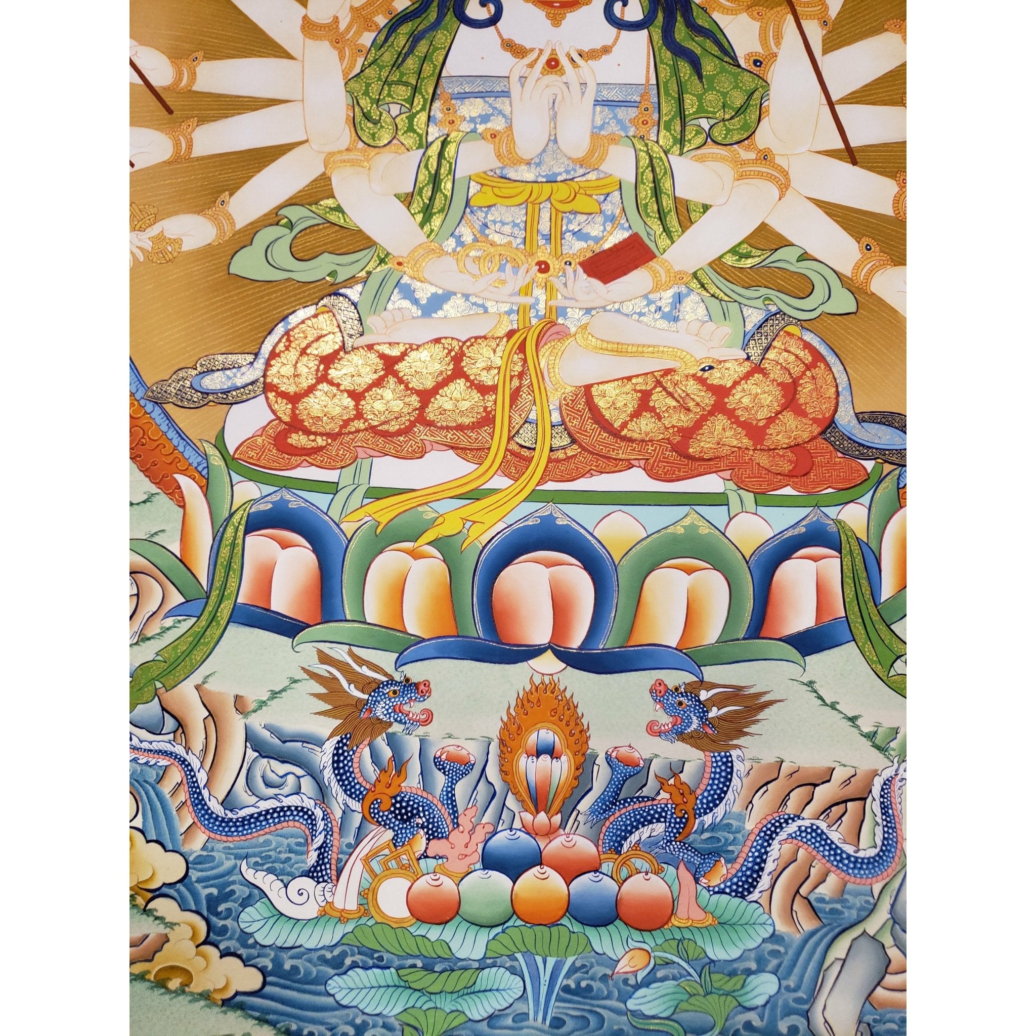 Maha Chundi Bodhisattva, also known by her secret name Great Victorious Vajrais, is revered as the mother of a billion Buddhas. She is one of the many manifestations of Avalokiteshvara, the bodhisattva of compassion. In this depiction, she is shown with 18 arms, each symbolizing the many skillful means of Tantra, which help to guide beings toward enlightenment.