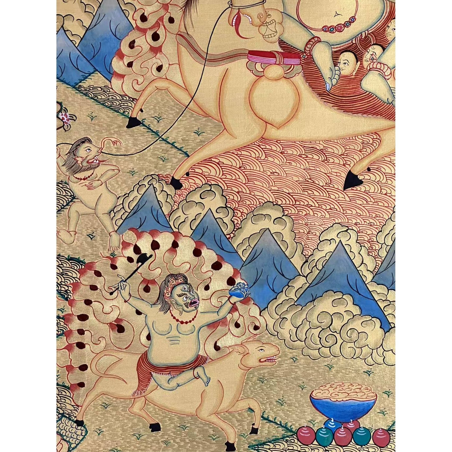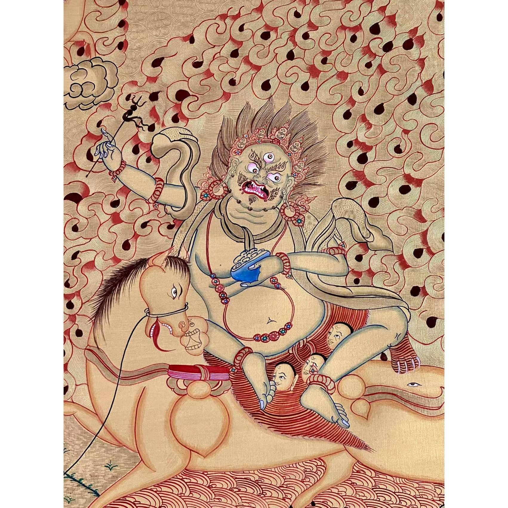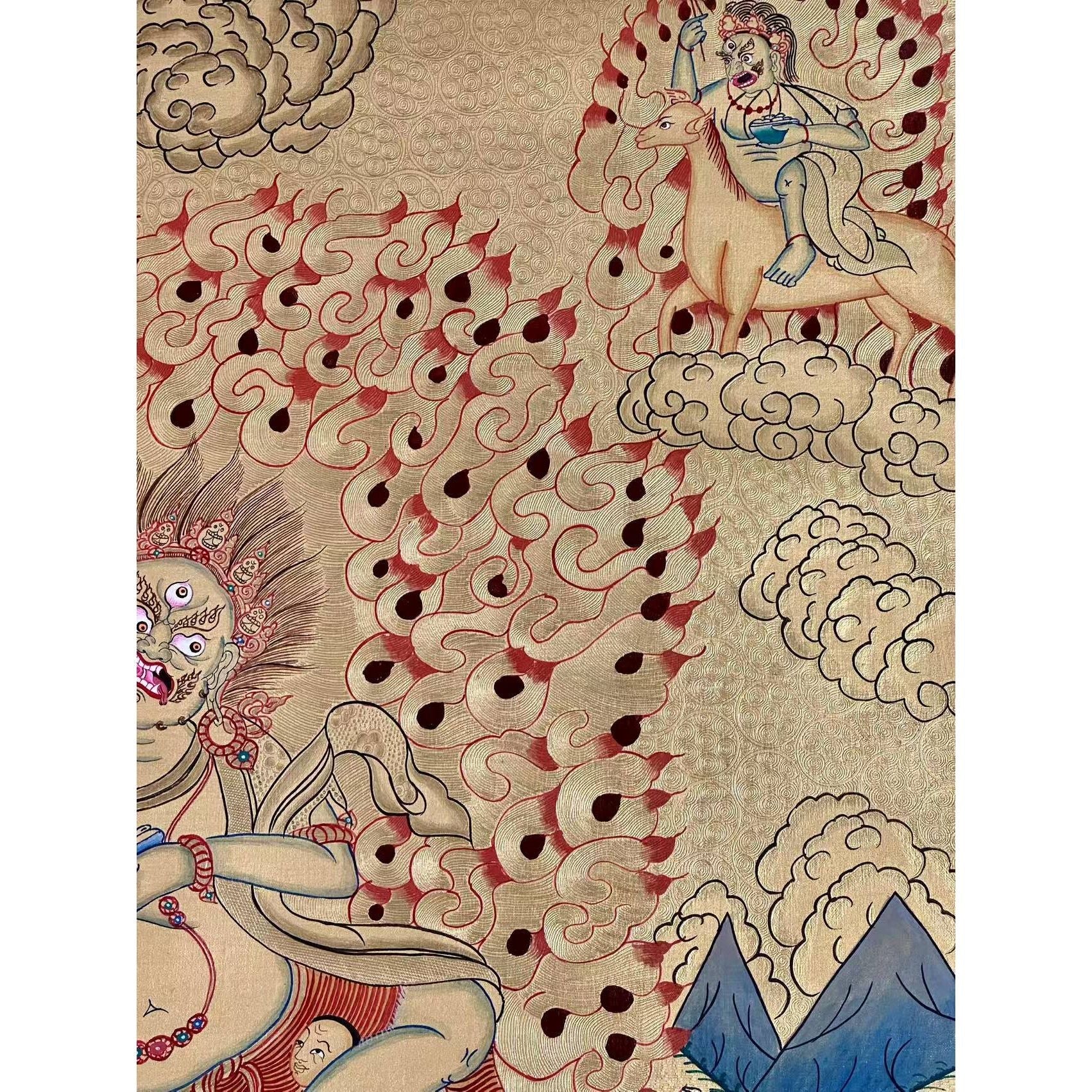 In this Thangka, Palden Lhamo is depicted riding side-saddle on a wild mule, crossing a sea of blood, symbolizing her strength and determination to protect Buddhism. Her three eyes symbolize her omniscient knowledge of the past, present, and future, while the third eye on her mule’s haunch augments her divine vision.