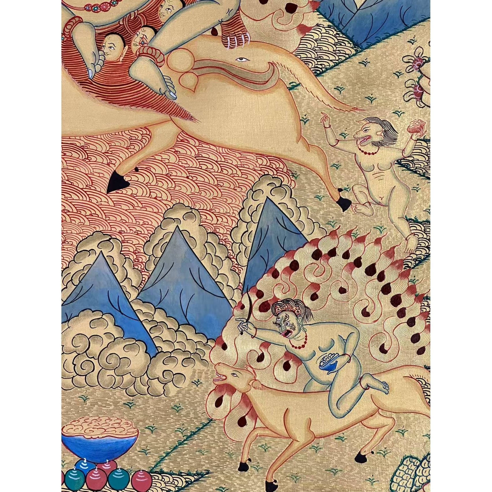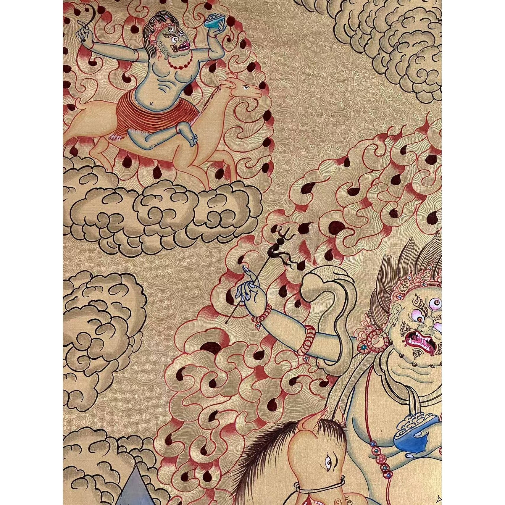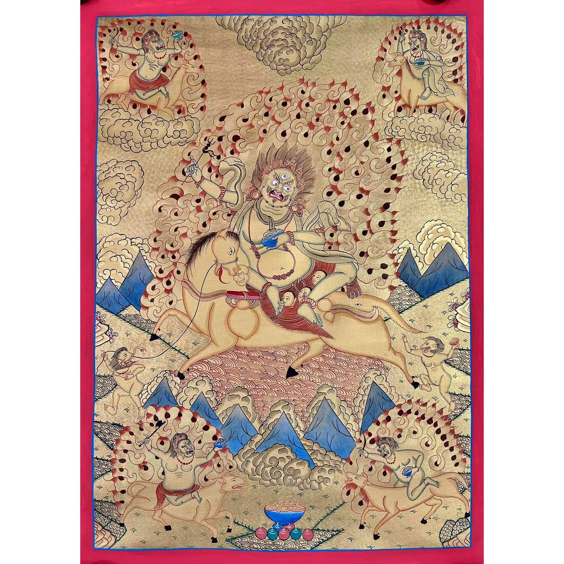 In this Thangka, Palden Lhamo is depicted riding side-saddle on a wild mule, crossing a sea of blood, symbolizing her strength and determination to protect Buddhism. Her three eyes symbolize her omniscient knowledge of the past, present, and future, while the third eye on her mule’s haunch augments her divine vision.