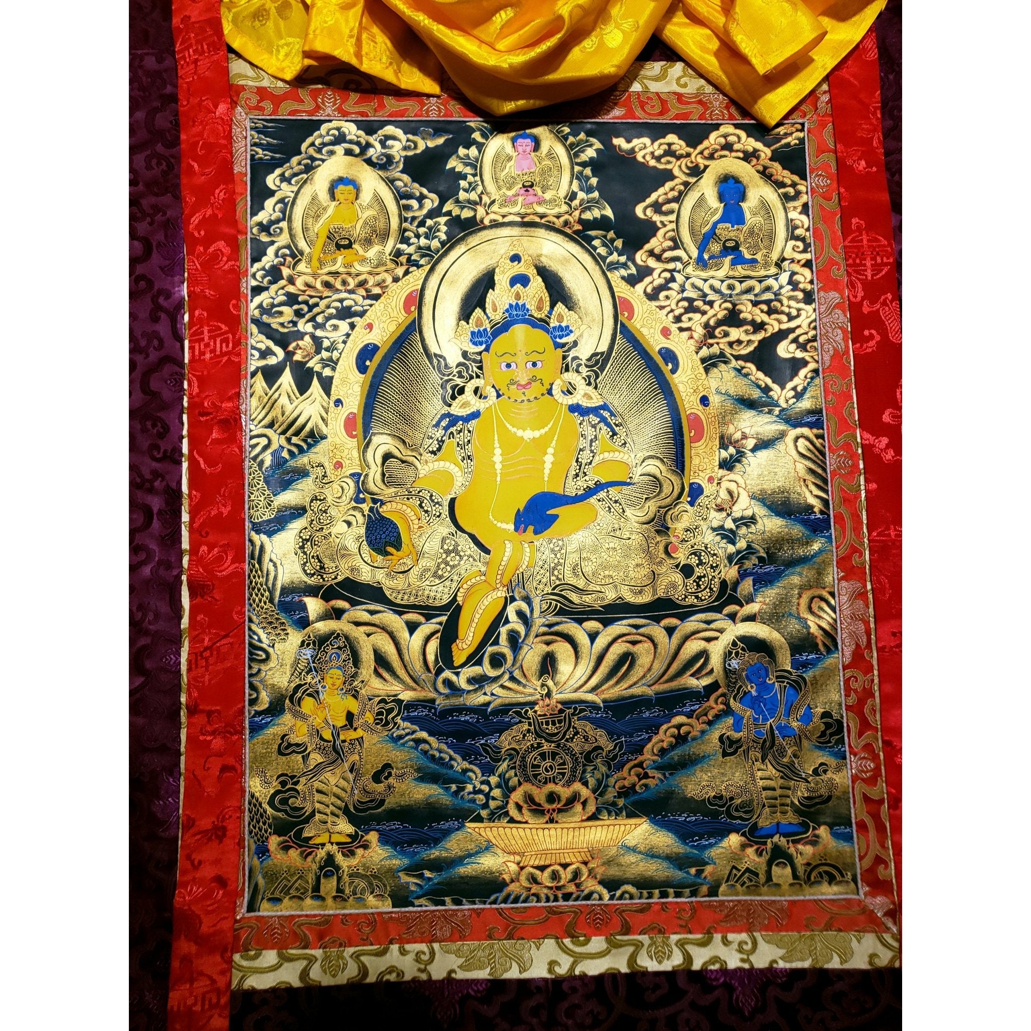 Elevate your home or office décor with the powerful presence of the Five Jambhalas in this exquisite Tibetan Thangka. Hand-painted by skilled artisans in the Kathmandu Valley, Nepal, this stunning artwork serves as both a spiritual and artistic centerpiece. Perfect for meditation spaces or as a focal point in your living room, the Five Jambhalas bring abundant energy, protection, and healing. This Thangka is not only a beautiful decorative piece but a sacred tool for attracting prosperity and spiritual growth.