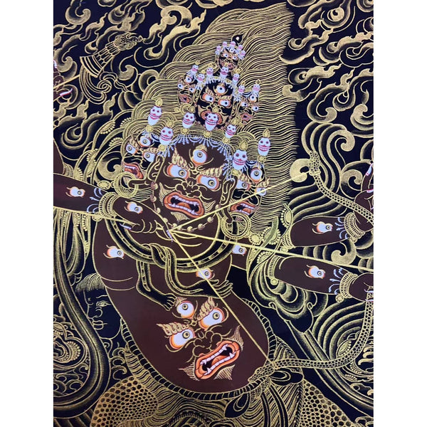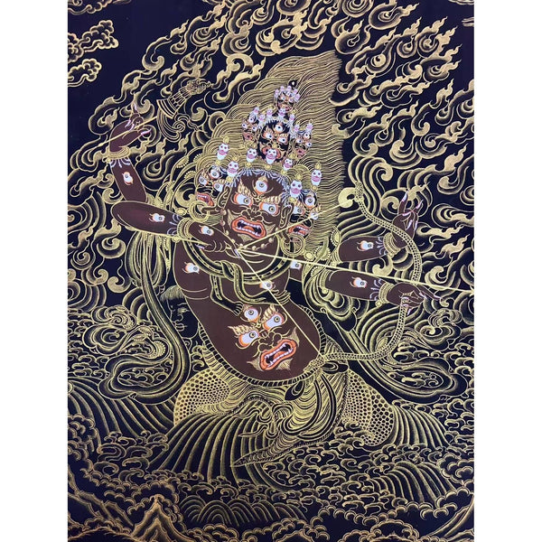 About Rahula – The Wrathful Protector Rahula is a fearsome Nyingma protector deity, known for his wrathful appearance and powerful presence. With nine heads and a giant face on his belly, Rahula embodies the fierce protection of Buddhist teachings, particularly the ‘revealed treasure’ (terma) teachings of Tibetan Buddhism.