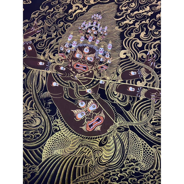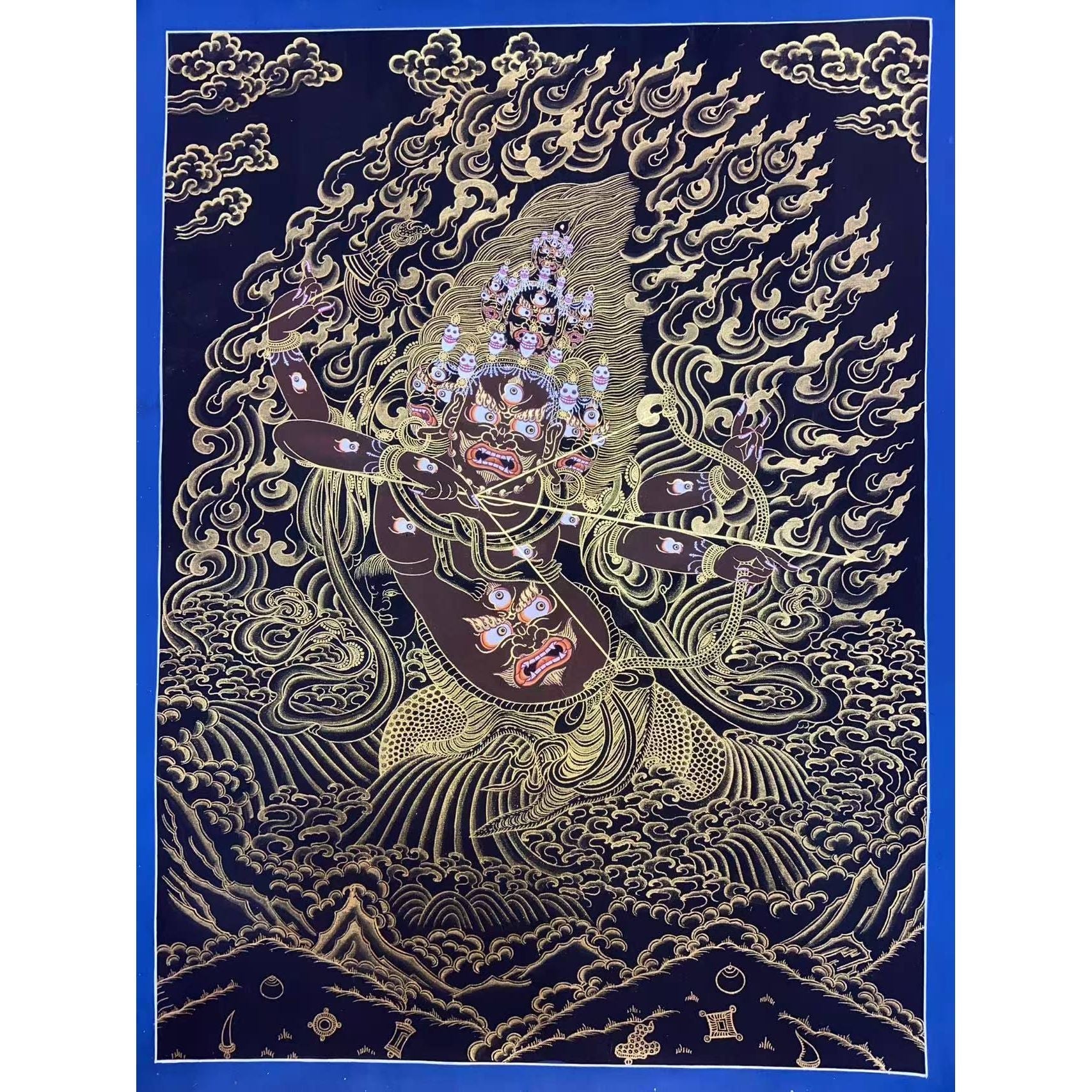 The depiction of Rahula includes a lower body shaped like a coiled serpent spirit, symbolizing his mastery over destructive forces. His upper body is adorned with four arms and nine heads, each representing a planet that Rahula has eclipsed—symbolically devouring them. At the center of his stomach lies a large, wrathful face, representing his insatiable hunger for the transformation of negative energies. At the top of the stack of heads rests a black raven, adding to his formidable and ominous presence.