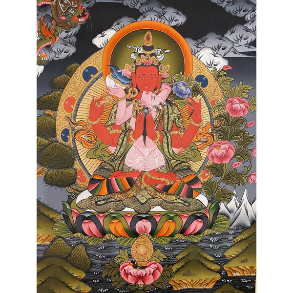 Red Chenrezig, also known as Gyalwa Gyatso, is an important figure in Tibetan Buddhism, particularly within the Nyingma and Kagyu traditions. As an embodiment of Avalokiteshvara (Chenrezig), the bodhisattva of compassion, he is revered for his boundless mercy and deep compassion for all sentient beings. In this Thangka, Red Chenrezig is depicted in a dynamic coral-red color, with one face and four arms. He is shown seated in vajra posture upon a white moon disc and a multicolored lotus, symbolizing purity and spiritual power.