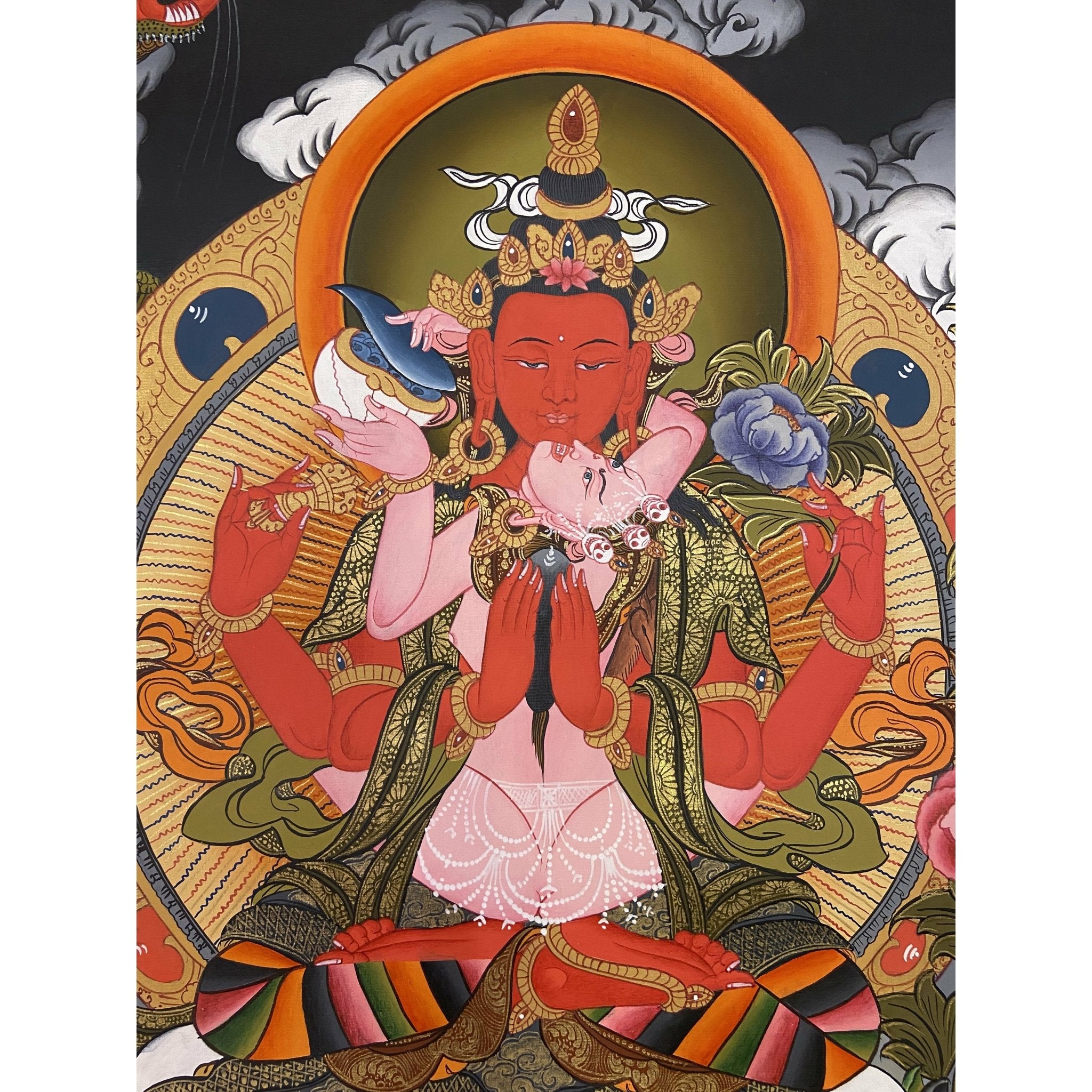 The red color represents the dynamic and active nature of compassion, aligning with the transformative power of Chenrezig in this form. His compassion is a force that turns negative emotions, such as aggression, into wisdom and kindness. As a Highest Yoga Tantra yidam deity, his practice is vital for those wishing to cultivate profound compassion and seek spiritual development.