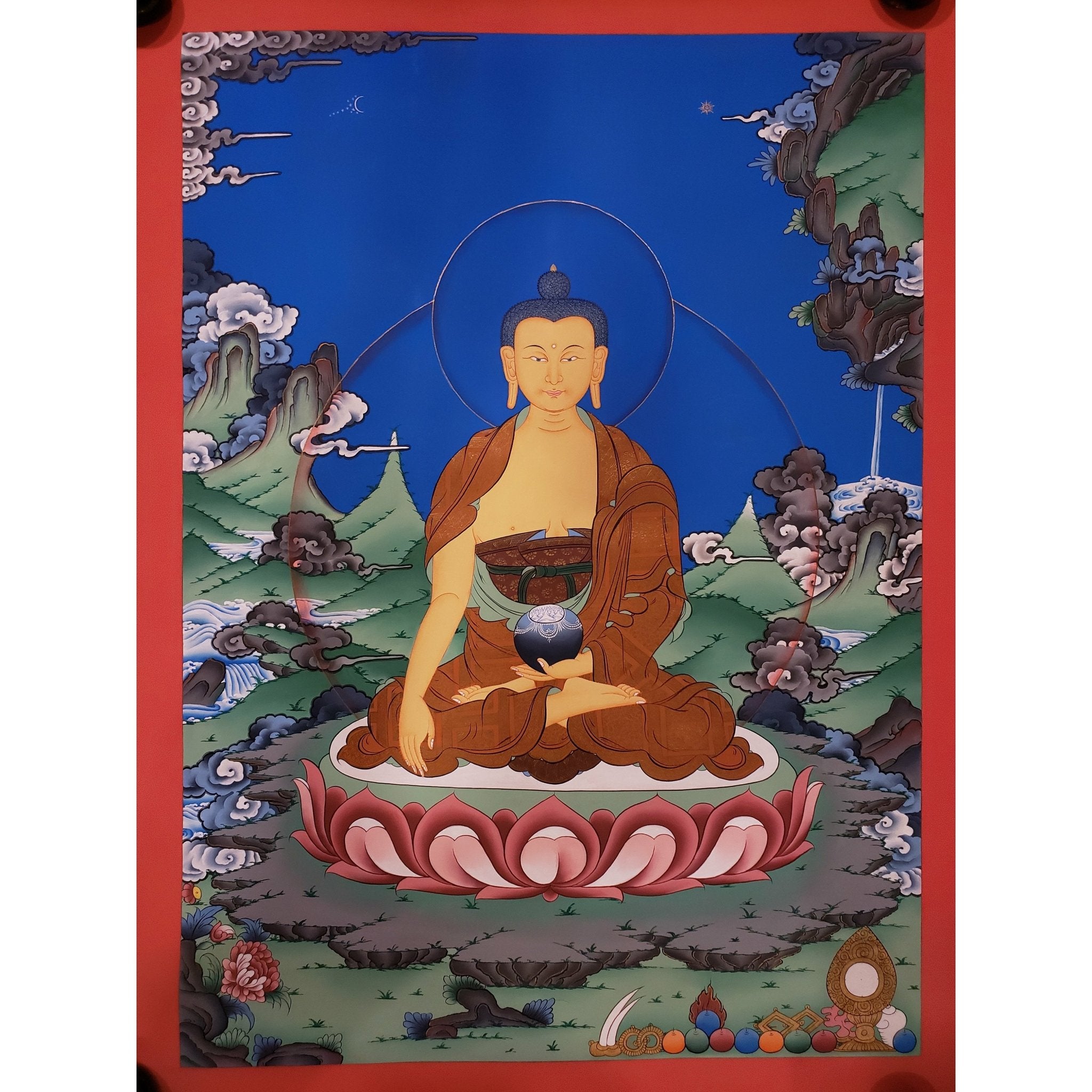 This hand-painted Tibetan Thangka depicting Shakyamuni Buddha is perfect for enhancing various home décor ideas. Crafted with 100% hand-drawn details in the Kathmandu Valley of Nepal, this Thangka can serve as an elegant and striking centerpiece in your home or office. It is also ideal for placement on your family altar for meditation and spiritual healing, attracting the benevolent energy of Tibetan Buddhist art.