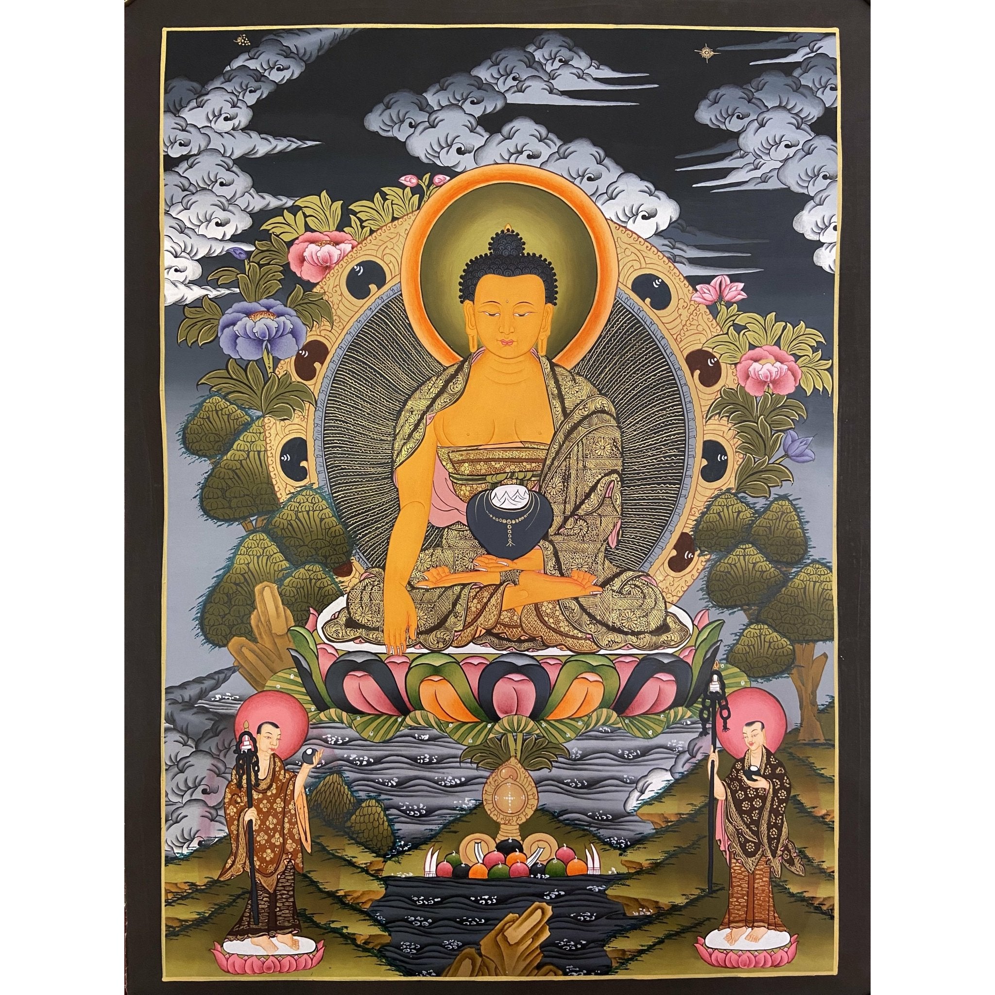 This hand-painted Tibetan Thangka depicting Shakyamuni Buddha is perfect for enhancing various home décor ideas. Crafted with 100% hand-drawn details in the Kathmandu Valley of Nepal, this Thangka can serve as an elegant and striking centerpiece in your home or office. It is also ideal for placement on your family altar for meditation and spiritual healing, attracting the benevolent energy of Tibetan Buddhist art.