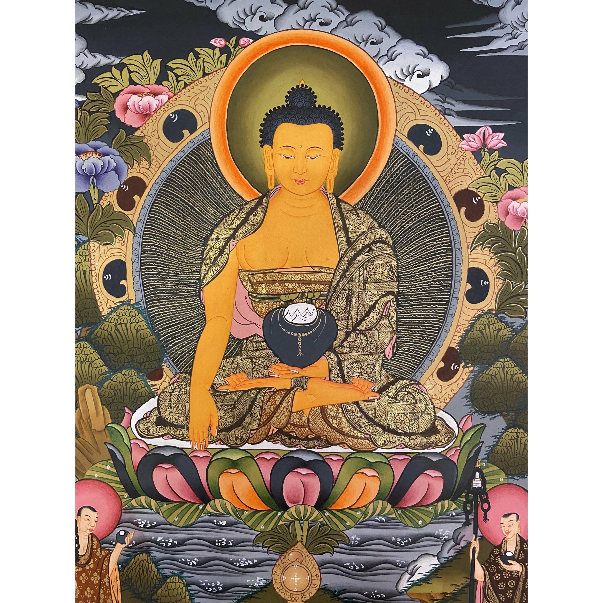 Shakyamuni Buddha, the historical Buddha, is considered the founder of Buddhist philosophy and is often referred to simply as "the Buddha." He is believed to have lived around 420 BC, spending much of his life spreading the teachings of Dharma. In Buddhism, each "kalpa" (a Buddhist eon) has its own Buddha whose teachings, over time, are forgotten before the next Buddha arrives. Shakyamuni’s life is richly detailed in the Thangka known as Life of Buddha, which portrays his journey to enlightenment.
