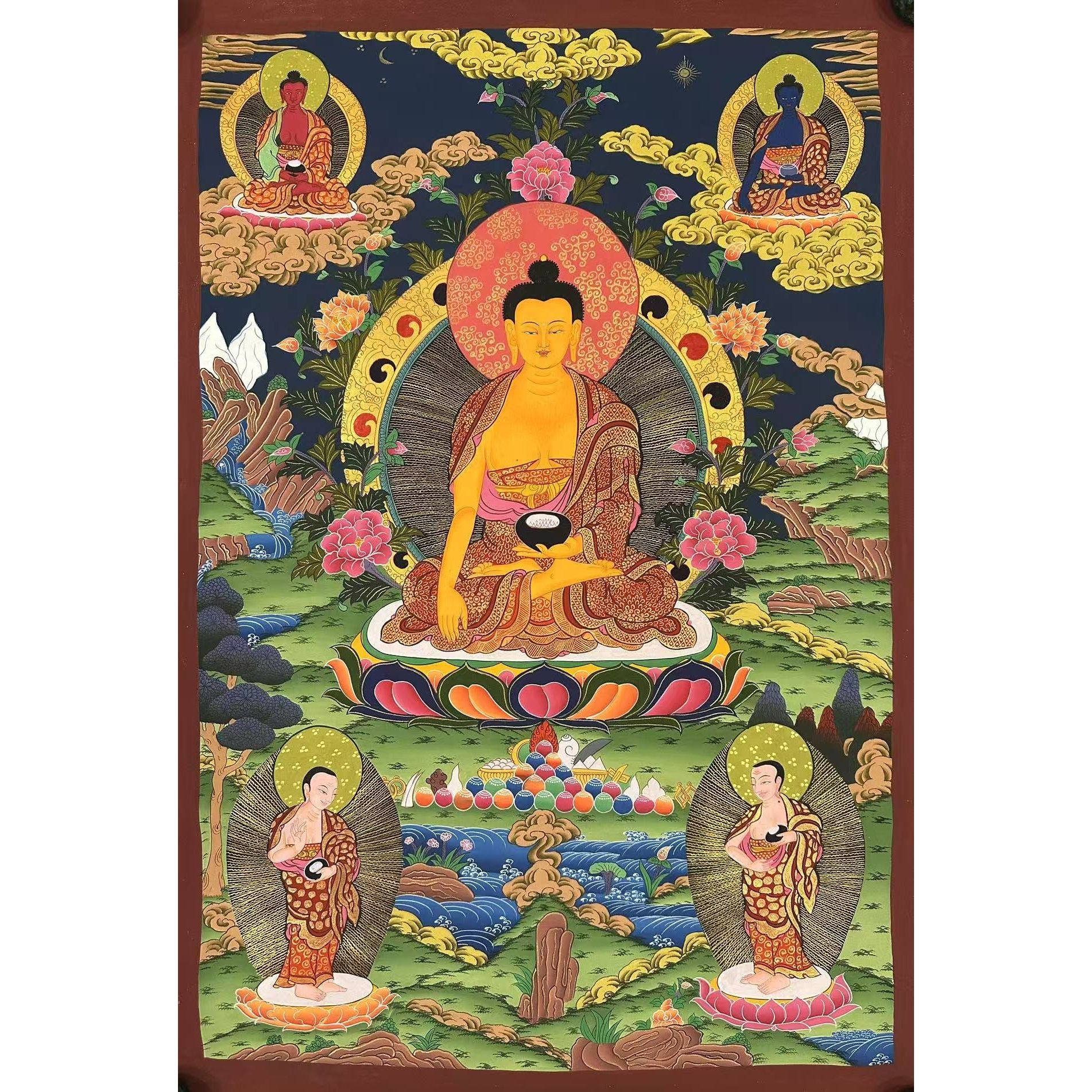 Shakyamuni Buddha is traditionally painted in shades of gold or beige and depicted in monastic robes while seated atop a lotus throne. Symbolically, the lotus seat represents living in this world without being tainted by its imperfections. The sun and moon are placed on the lotus to symbolize prajna (wisdom) and upaya (compassionate means) respectively.